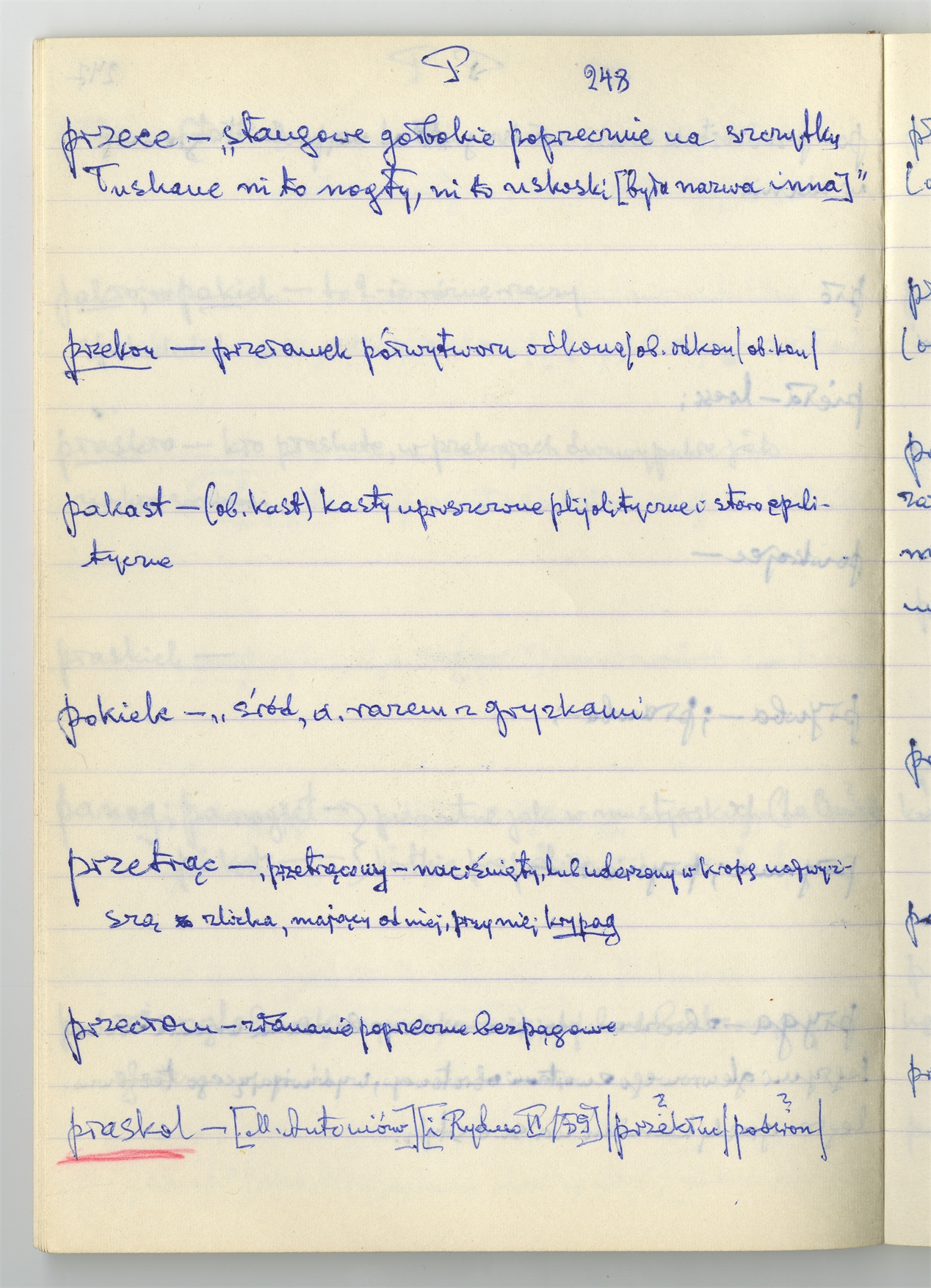 Rękopis słownika sporządzony w zeszycie w linię zatytułowany "Zumia stosowana P-R i S2 W2 Z2 s. 241-360" - strona 9: hasła słownikowe na literę P c.d. (autorska strona 248)