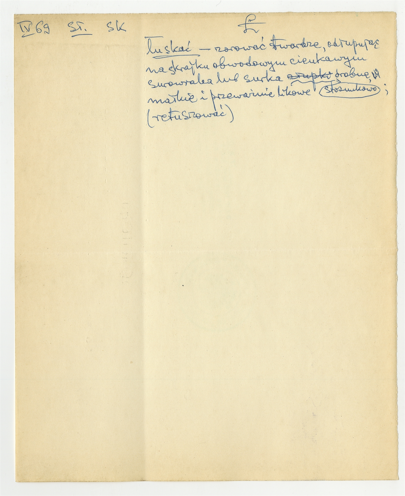 Rękopis słownika w postaci luźnych kartek - strona 110: hasło słownikowe na literę Ł IV [19]69