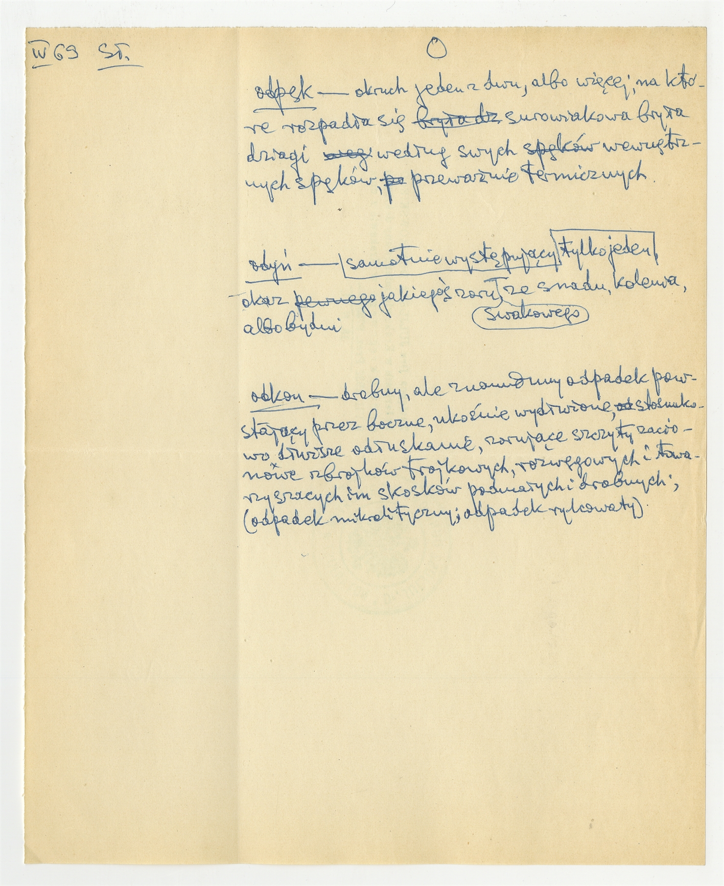 Rękopis słownika w postaci luźnych kartek - strona 136: hasła słownikowe na literę O IV [19]69
