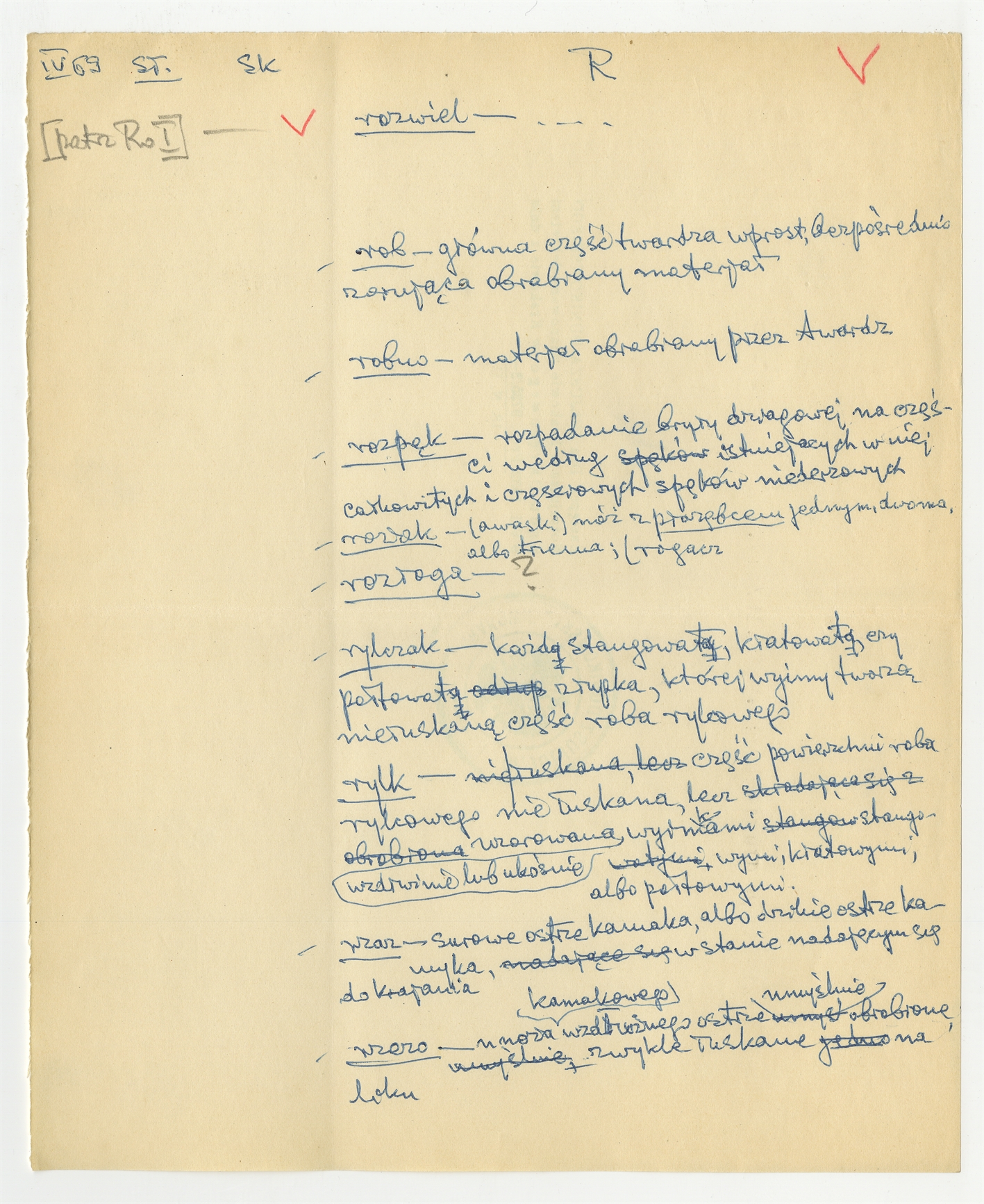 Rękopis słownika w postaci luźnych kartek - strona 151: hasła słownikowe na literę R IV [19]69