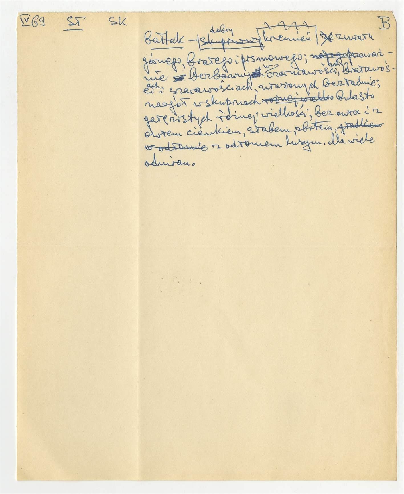 Rękopis słownika w postaci luźnych kartek - strona 19: hasło słownikowe na literę B IV [19]69