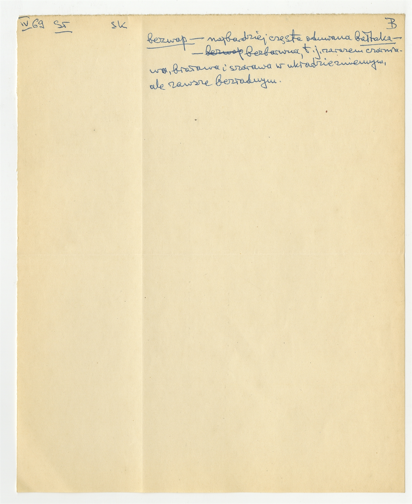 Rękopis słownika w postaci luźnych kartek - strona 23: hasło słownikowe na literę B IV [19]69