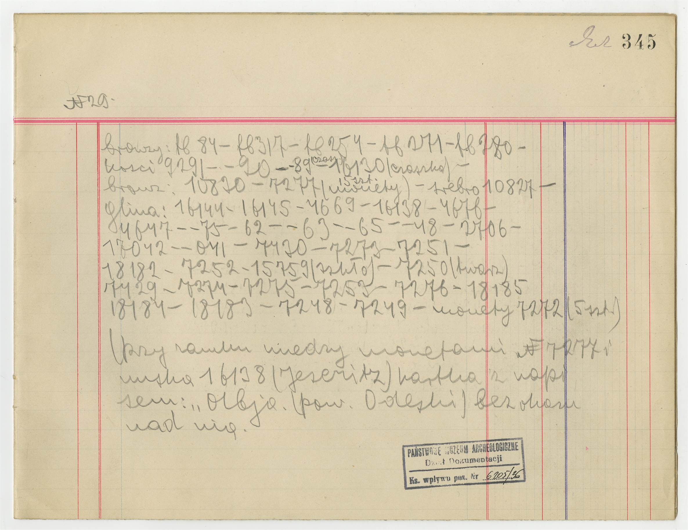 Rękopis - Spis numerów inwentarzy zabytków w gablotach wystawowych MEM - witryna N29