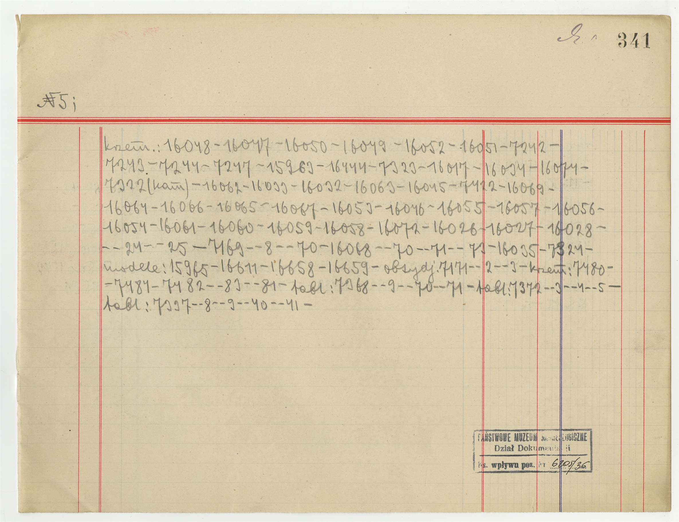 Rękopis - Spis numerów inwentarzy zabytków w gablotach wystawowych MEM - witryna N5