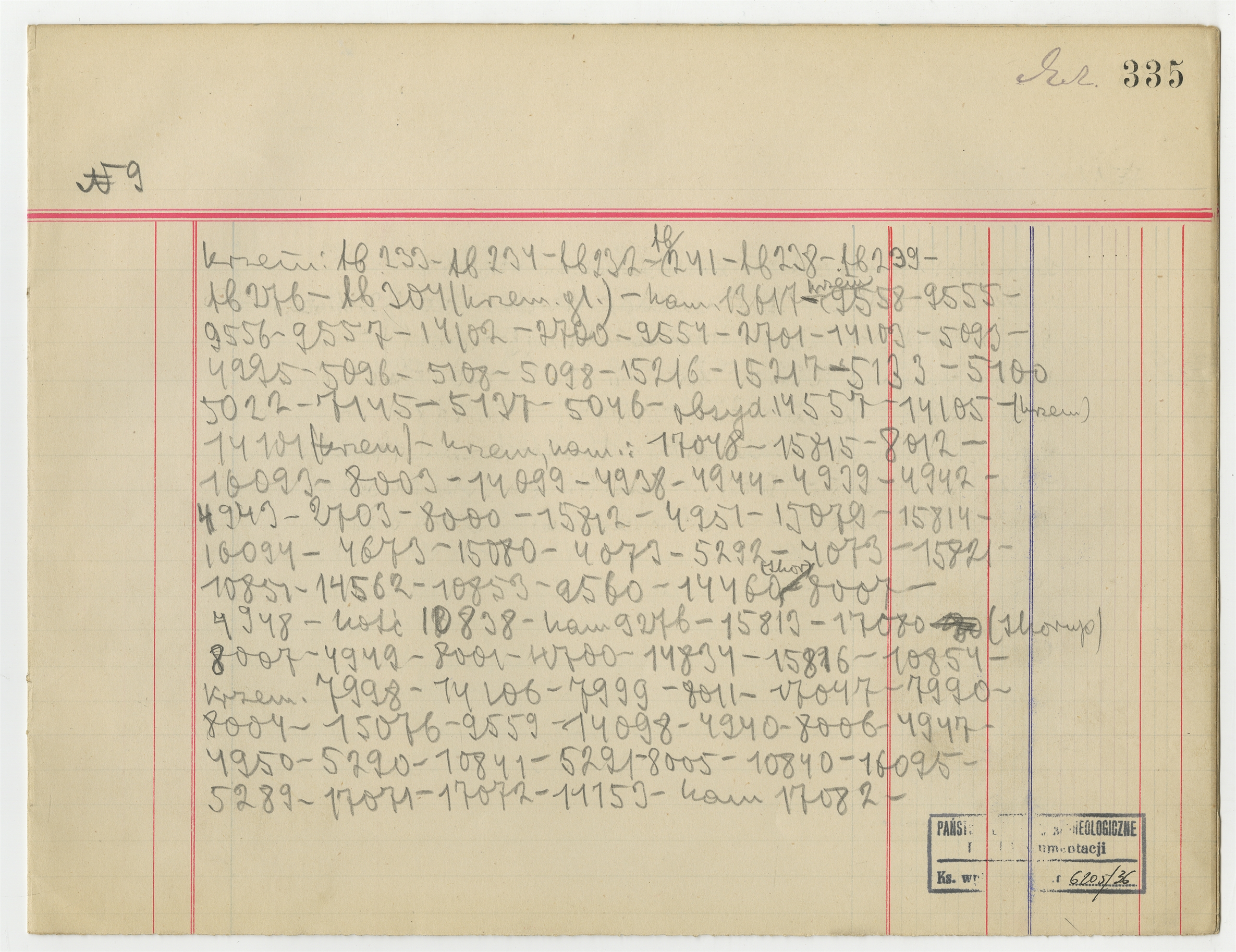 Rękopis - Spis numerów inwentarzy zabytków w gablotach wystawowych MEM - witryna N9