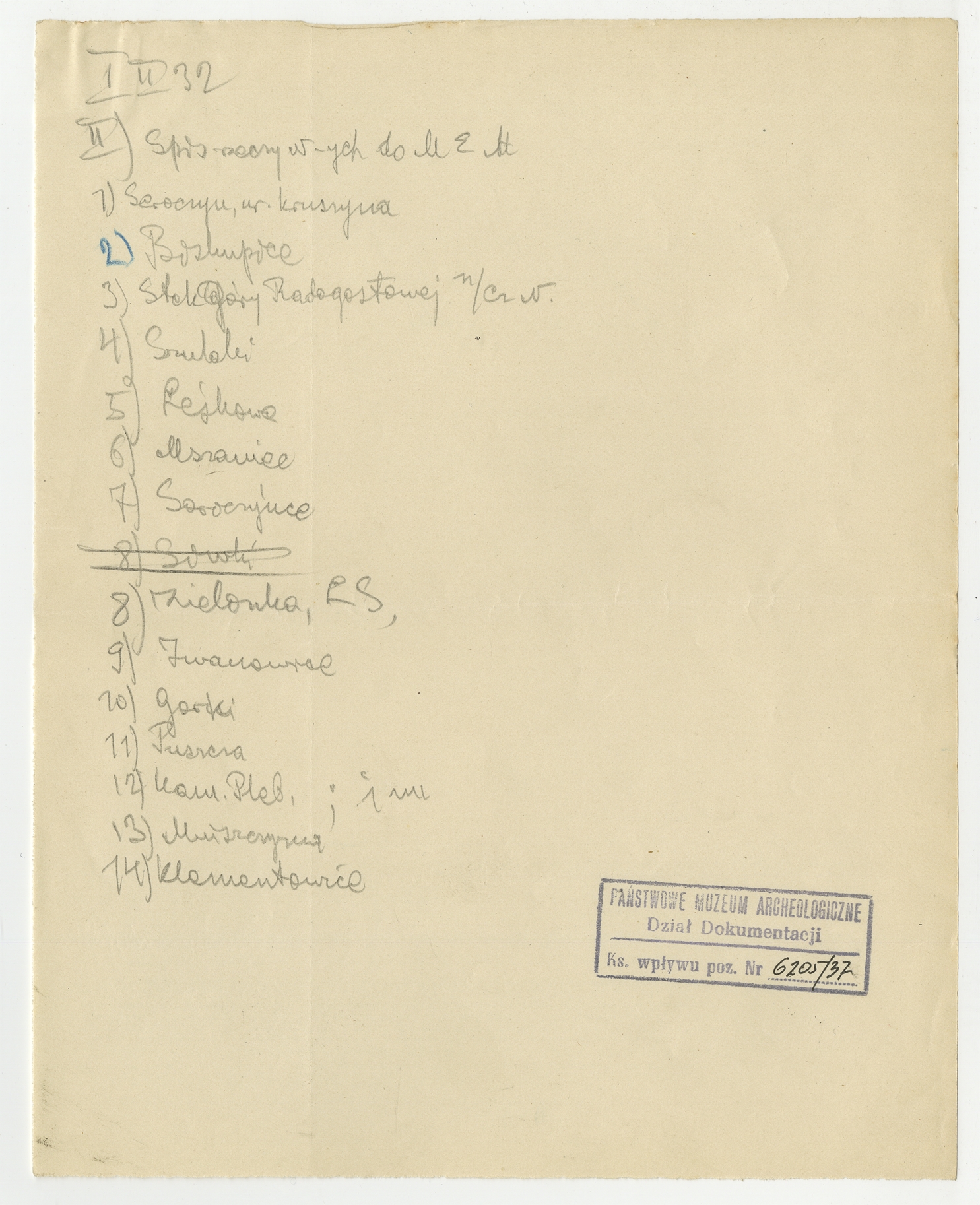 Rękopis spisu stanowisk archeologicznych - strona 2: "II. Spis rzeczy w-ych do MEM" I-II [19]32