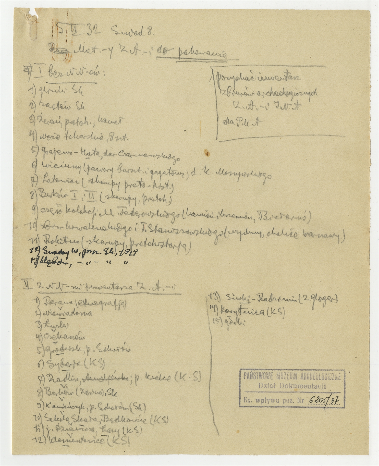 Rękopis spisu stanowisk archeologicznych - strona 3: "Mat.-y ZA i do pakowania" 15 II [19]32