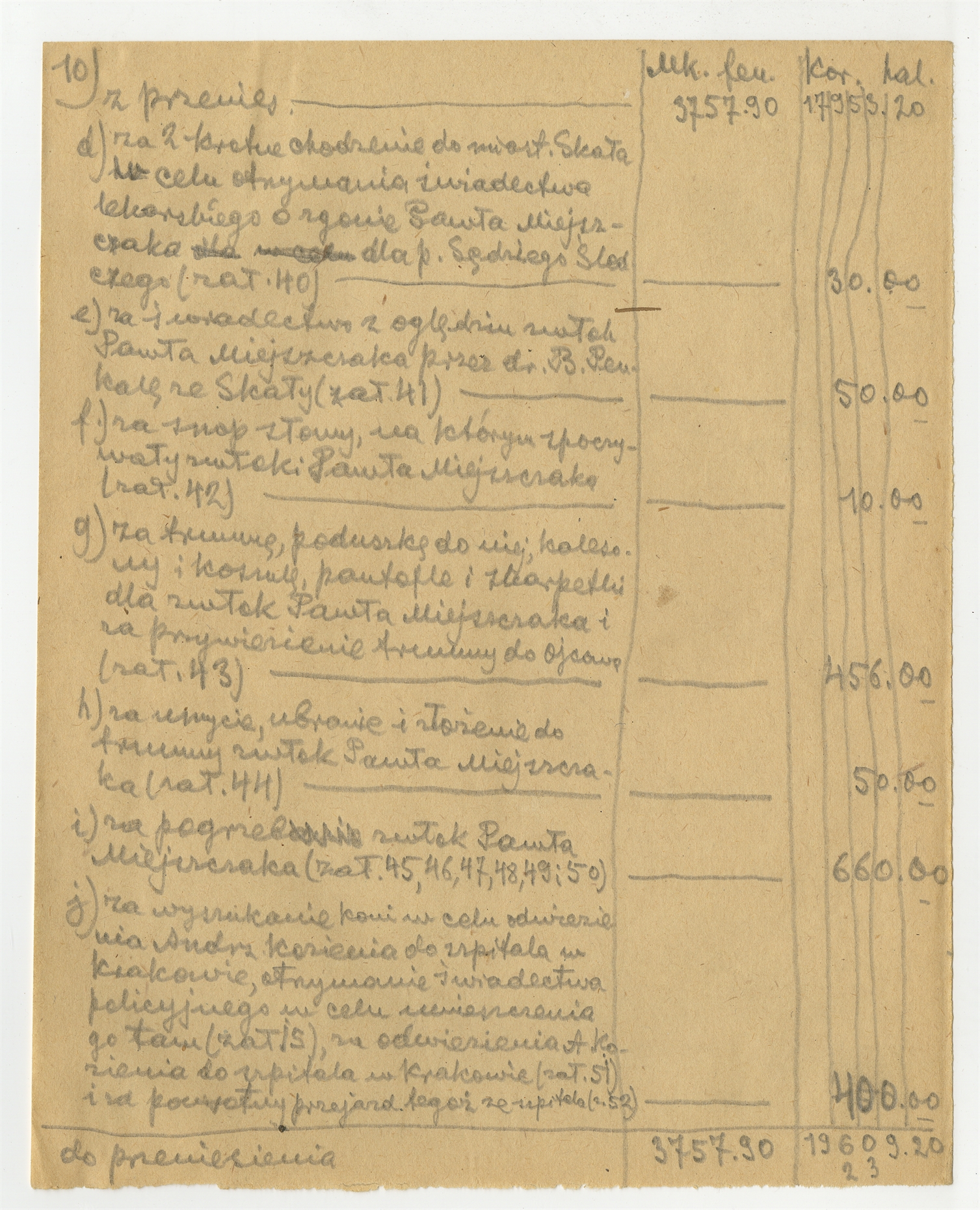 Rękopis "Sprawozdania finansowego Stefana Krukowskiego z robót jaskiniowych w r. 1919" - strona 12: "za dwukrotne chodzenie" … "tegoż ze szpitala (…) (autorska strona 10)