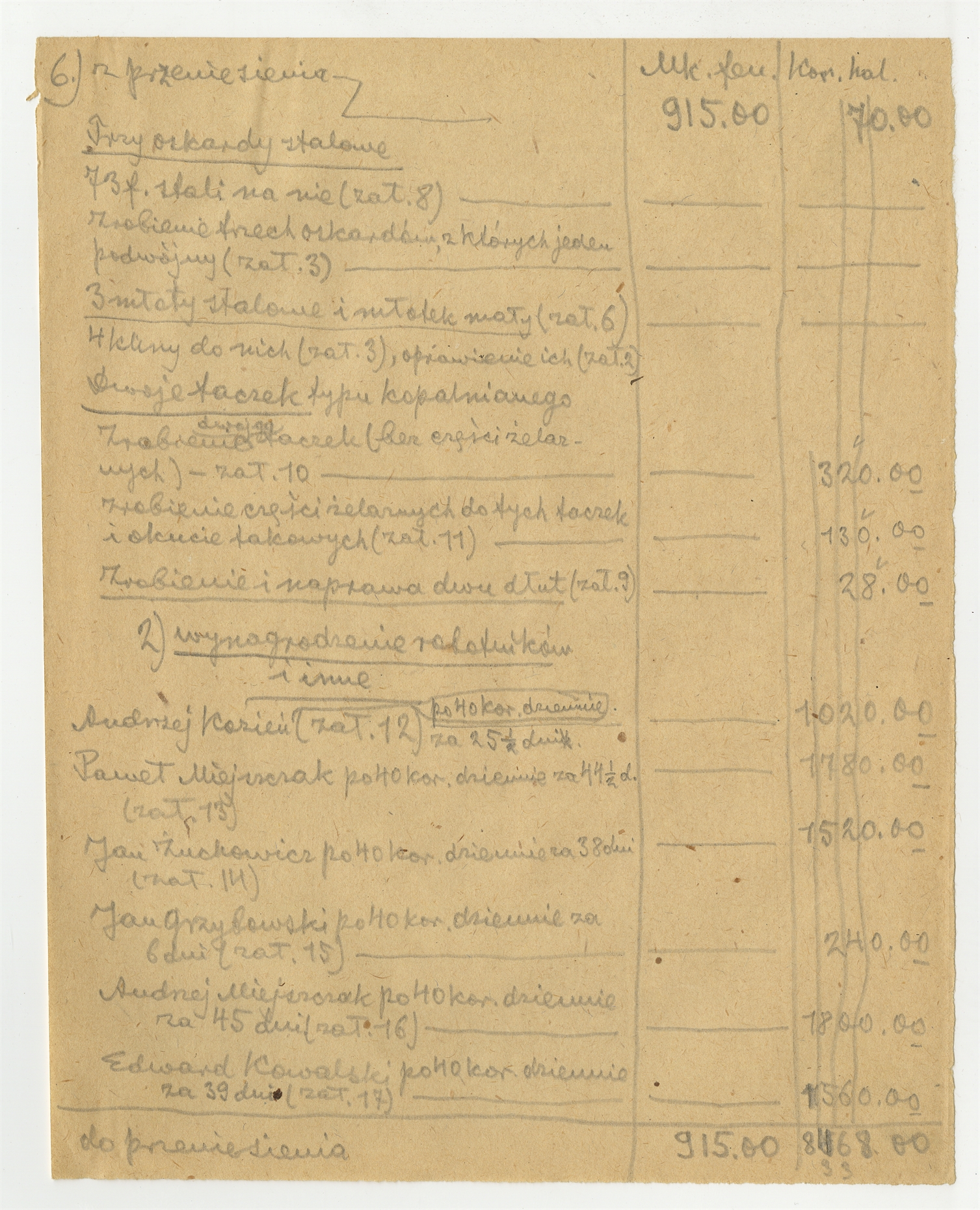 Rękopis "Sprawozdania finansowego Stefana Krukowskiego z robót jaskiniowych w r. 1919" - strona 8: zatytułowana "z przeniesienia" "Trzy oskardy stalowe" … "do przeniesienia 915.00" (autorska strona 6)