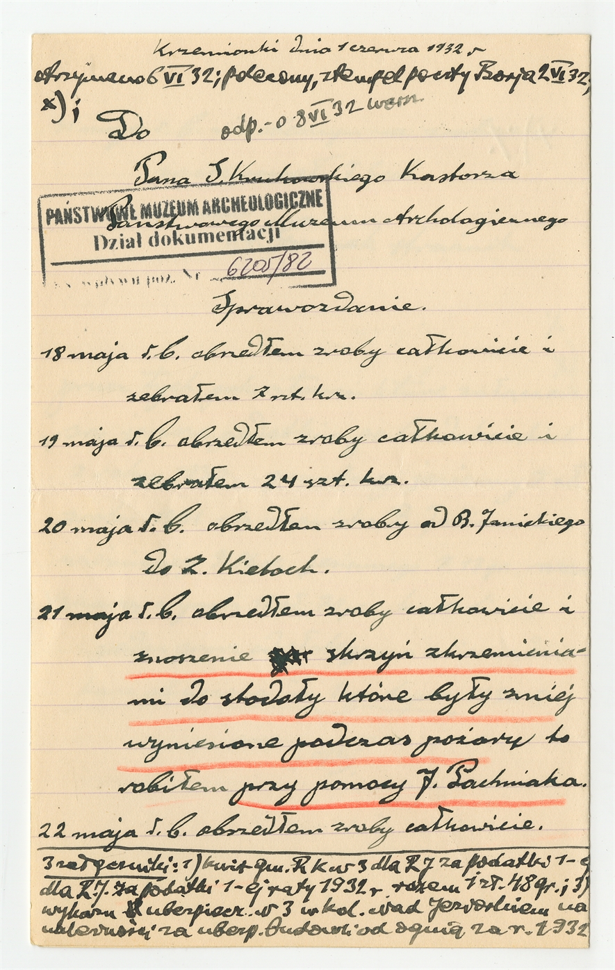 Rękopis - sprawozdanie strażnika Krzemionek A. Gromka z dnia 1 czerwca 1932 roku z okresu 18 - 31 maja 1932 roku