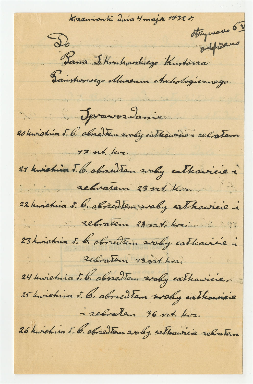 Rękopis - sprawozdanie strażnika Krzemionek A. Gromka z dnia 4 maja 1932 roku z okresu 20 kwietnia - 3 maja 1932 roku