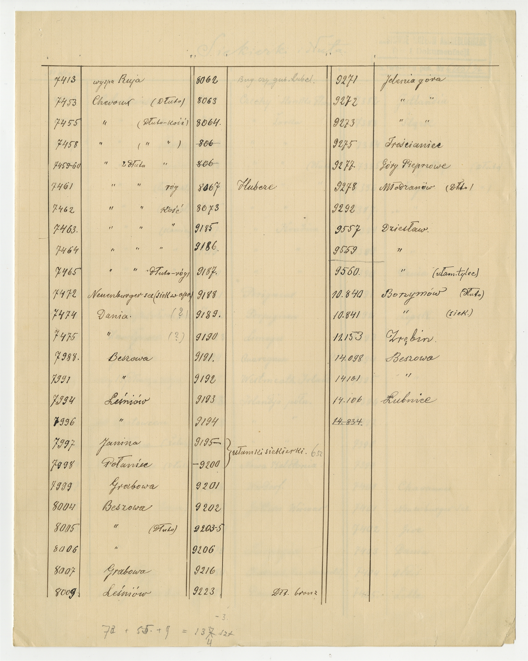Rękopis - tabela z inwentarzem MEM wg typu zabytku - "Siekierki i Nuta" nr okazu 7413 i następne