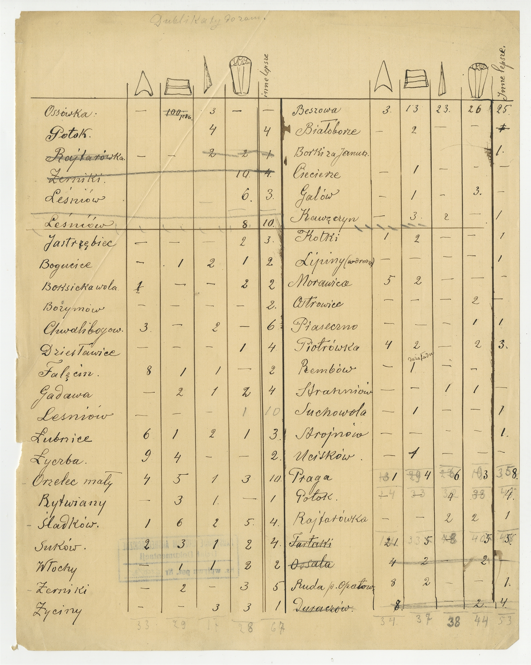 Rękopis - tabela ze spisem zabytków krzemiennych wg miejscowości (Osówka Potok…) i typów. Ręką E. Majewskiego dopisek ołówkiem "Duplikaty do zam."