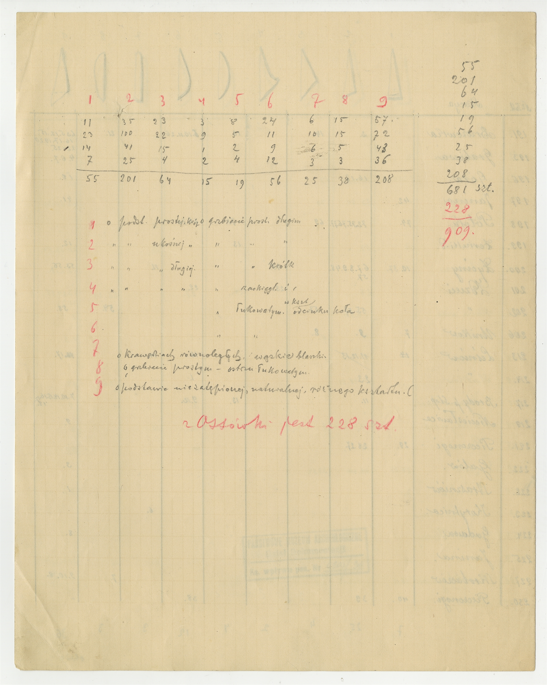 Rękopis - tabela ze spisem zabytków MEM wg tabel typów i miejscowości. Notatka z opisem i zestawieniem statystycznym 9 typów zabytków krzemiennych