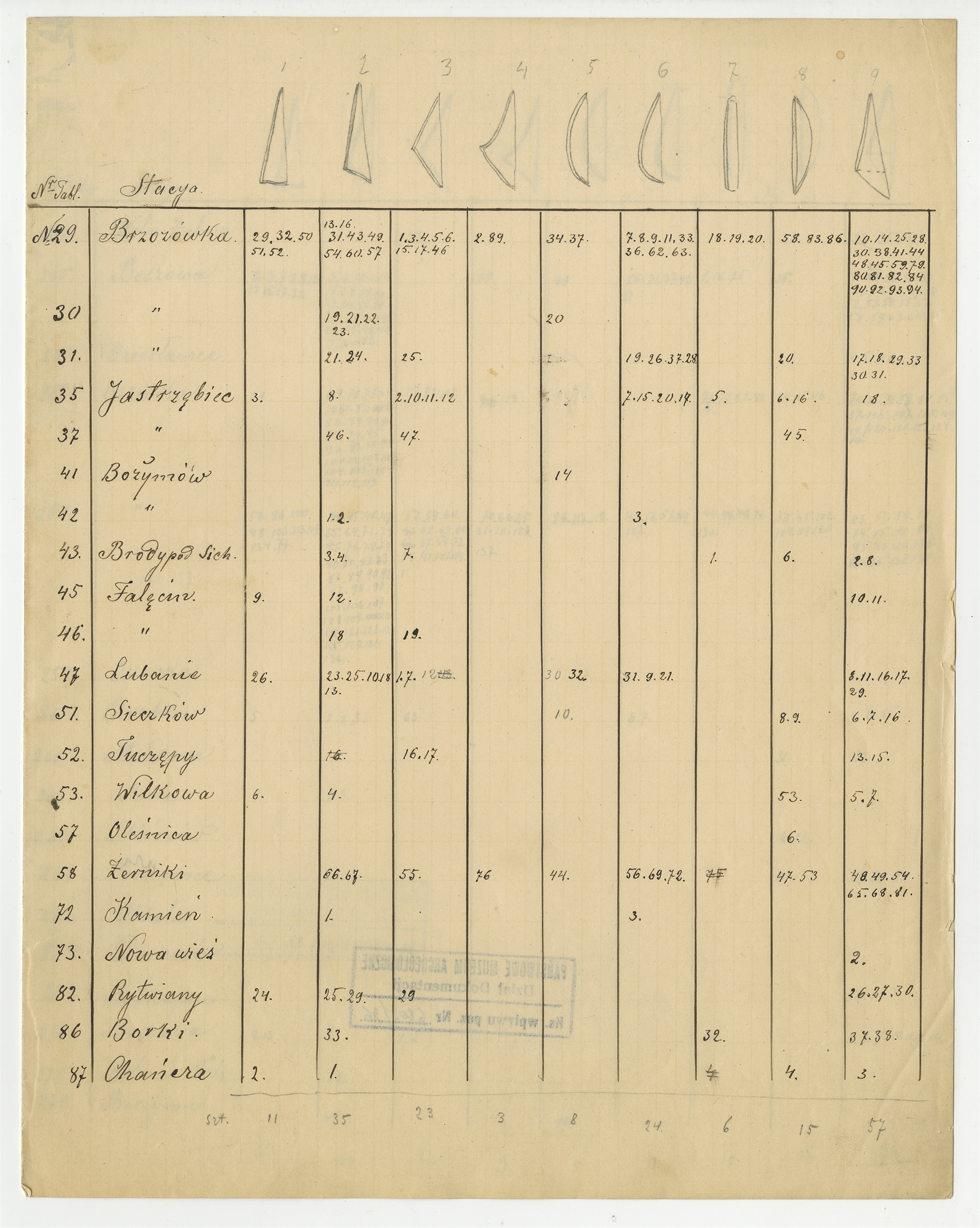 Rękopis - tabela ze spisem zabytków MEM wg tabel typów i miejscowości. Tablice 29-87