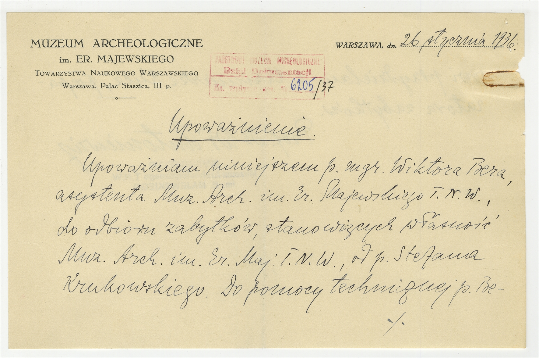 Rękopis upoważnienia mgr. Wiktora Bera asystenta Muzeum Archeologicznego im. Er. Majewskiego T.N.W. do odbioru zabytków od Stefana Krukowskiego Warszawa 26 stycznia 1936 - strona 1