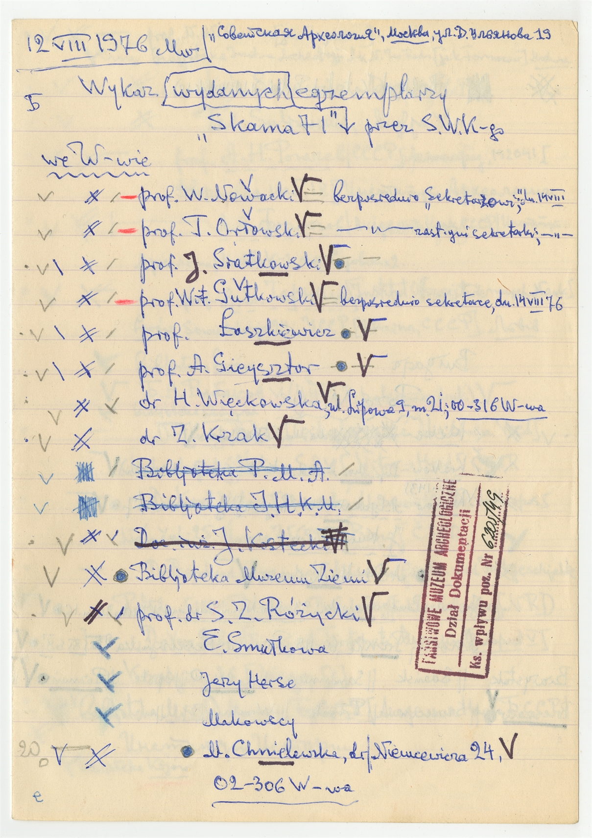 Rękopis - wykaz adresów z dn. 12 VIII 1976 r.