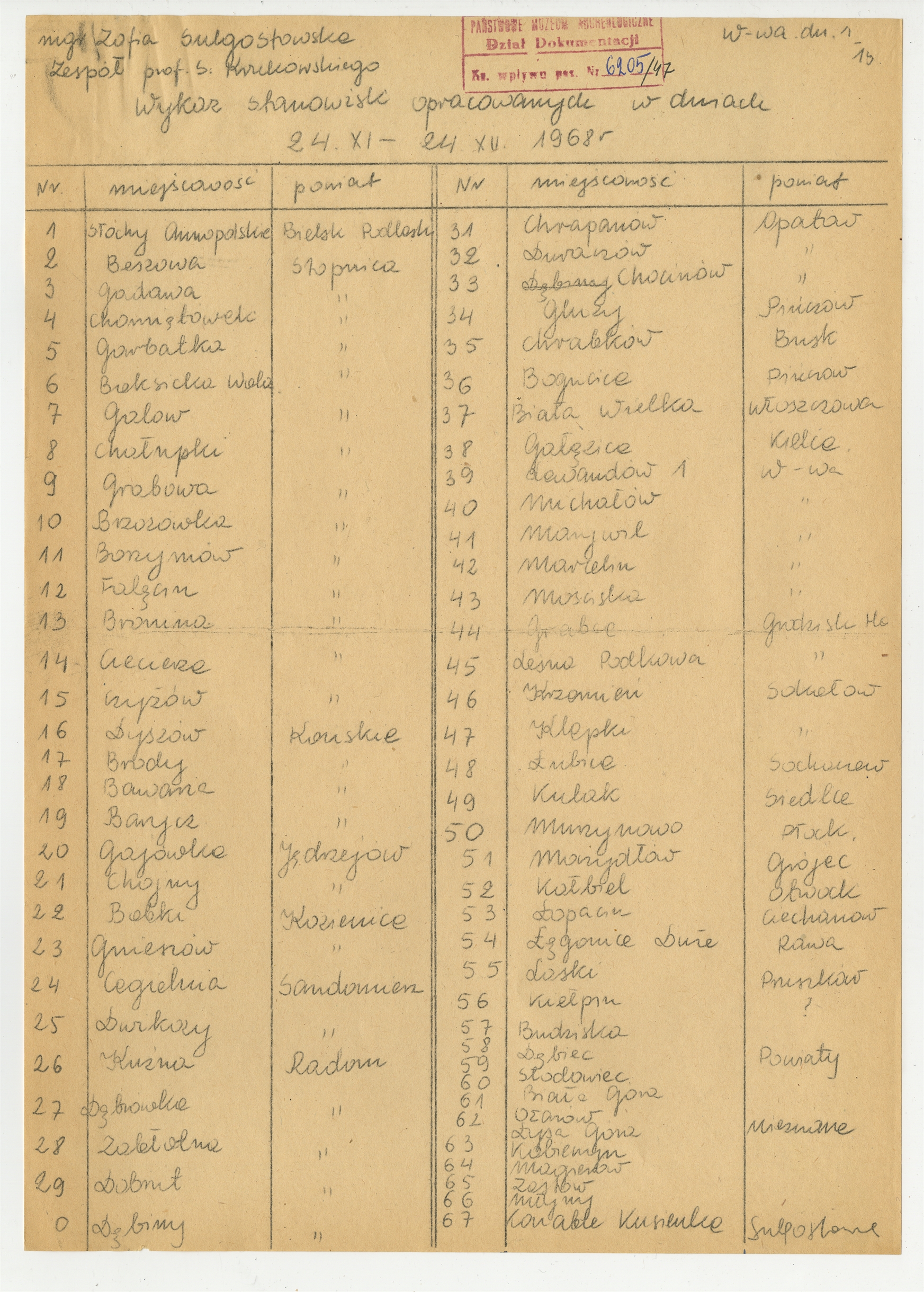 Rękopis wykazu stanowisk opracowanych w dniach 24 XI-24 XII 1968 r. przez Zofię Sulgostowską  członka Zespołu prof. Stefana Krukowskiego przy Muzeum Ziemi PAN  Warszawa  grudzień 1968 r. - strona 1