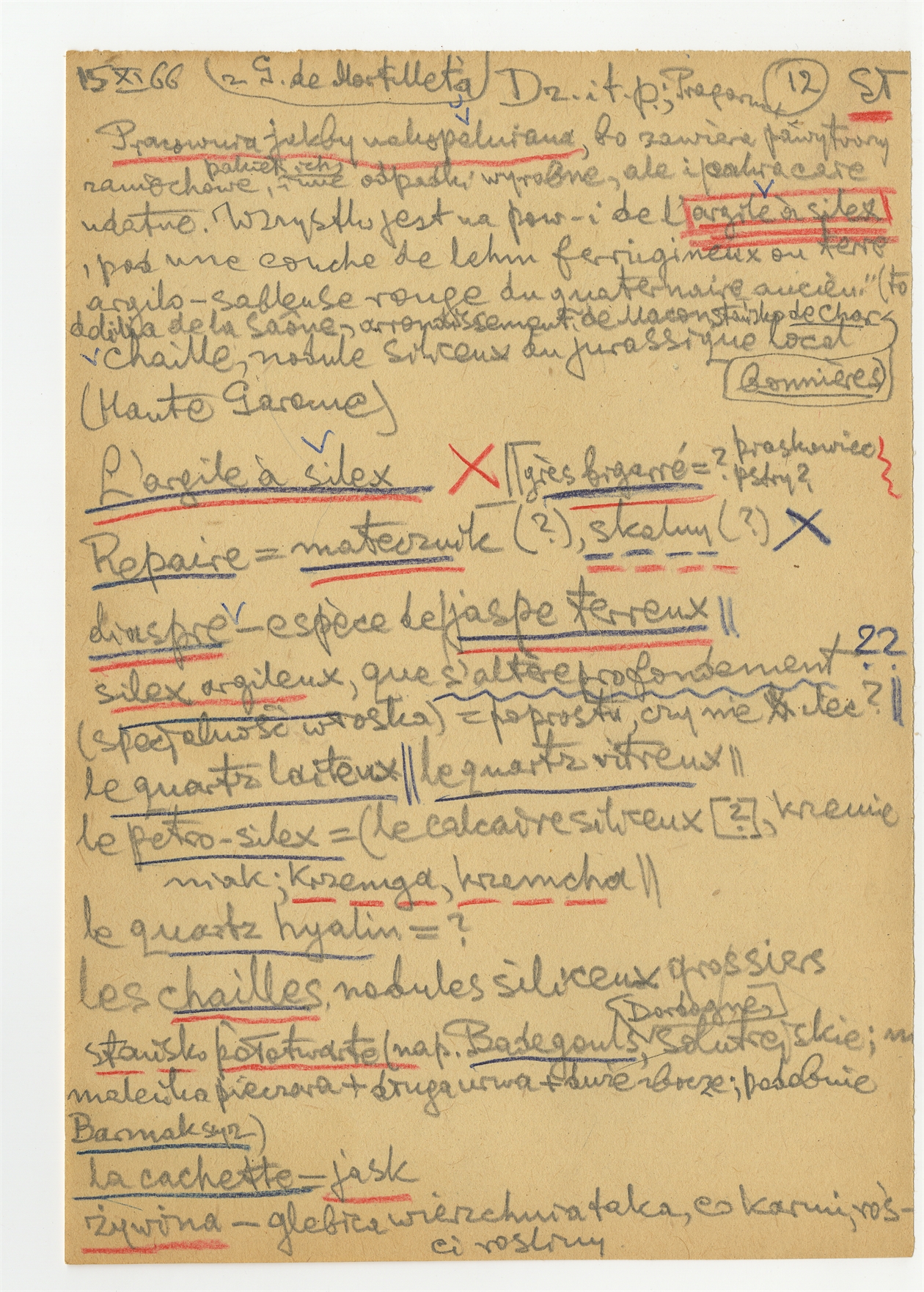 Rękopis wypisów z nieokreślonej publikacji G. de Mortillet'a do pracy "Dziagi w P." i innych - strona 12: "Pracownia jakby nakopalniana" […] "żywina" 15 XI [19]66