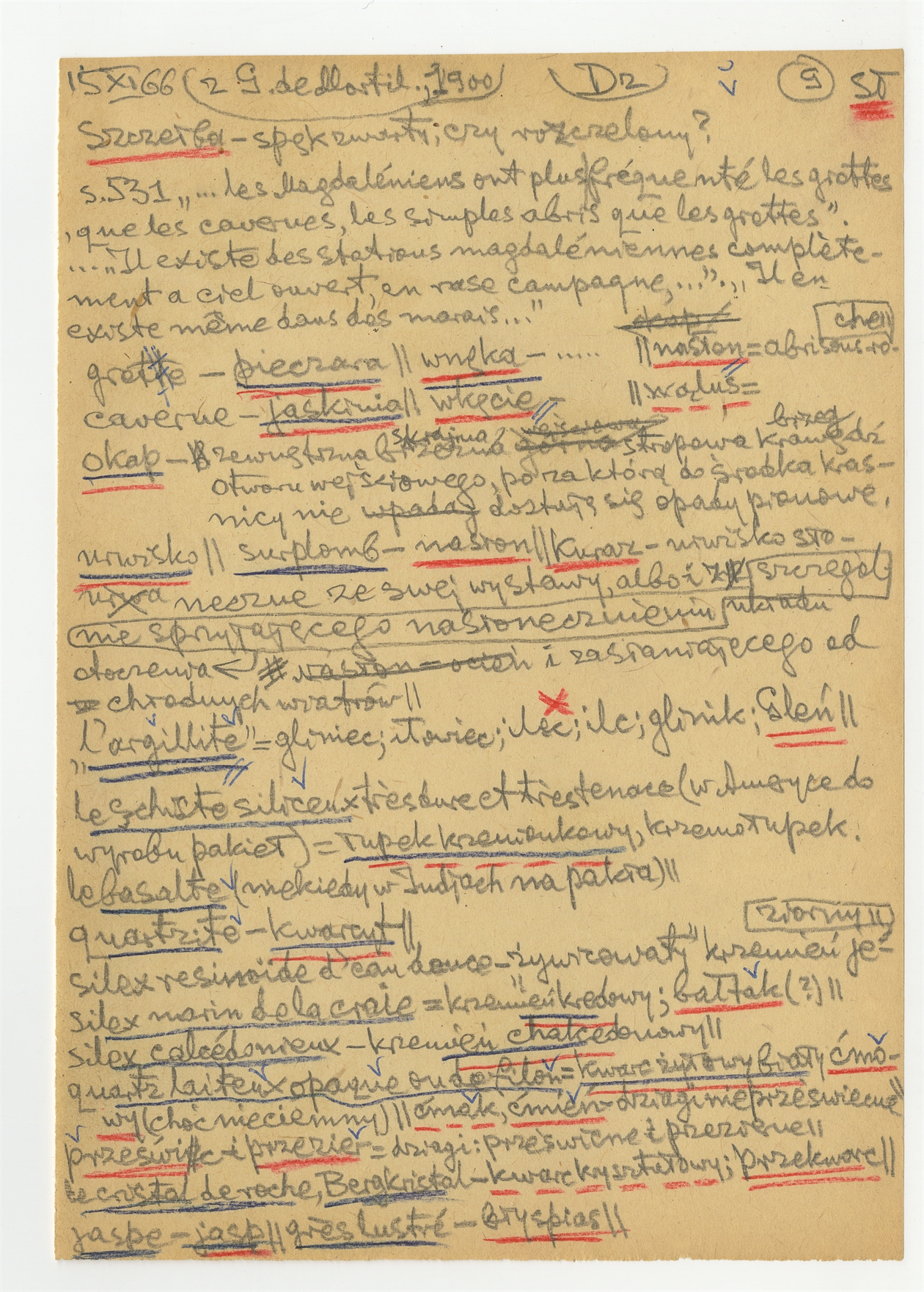 Rękopis wypisów z nieokreślonej publikacji G. de Mortillet'a do pracy "Dziagi w P." i innych - strona 9: "Szczełba" […] "gr?s lustré" 15 XI [19]66