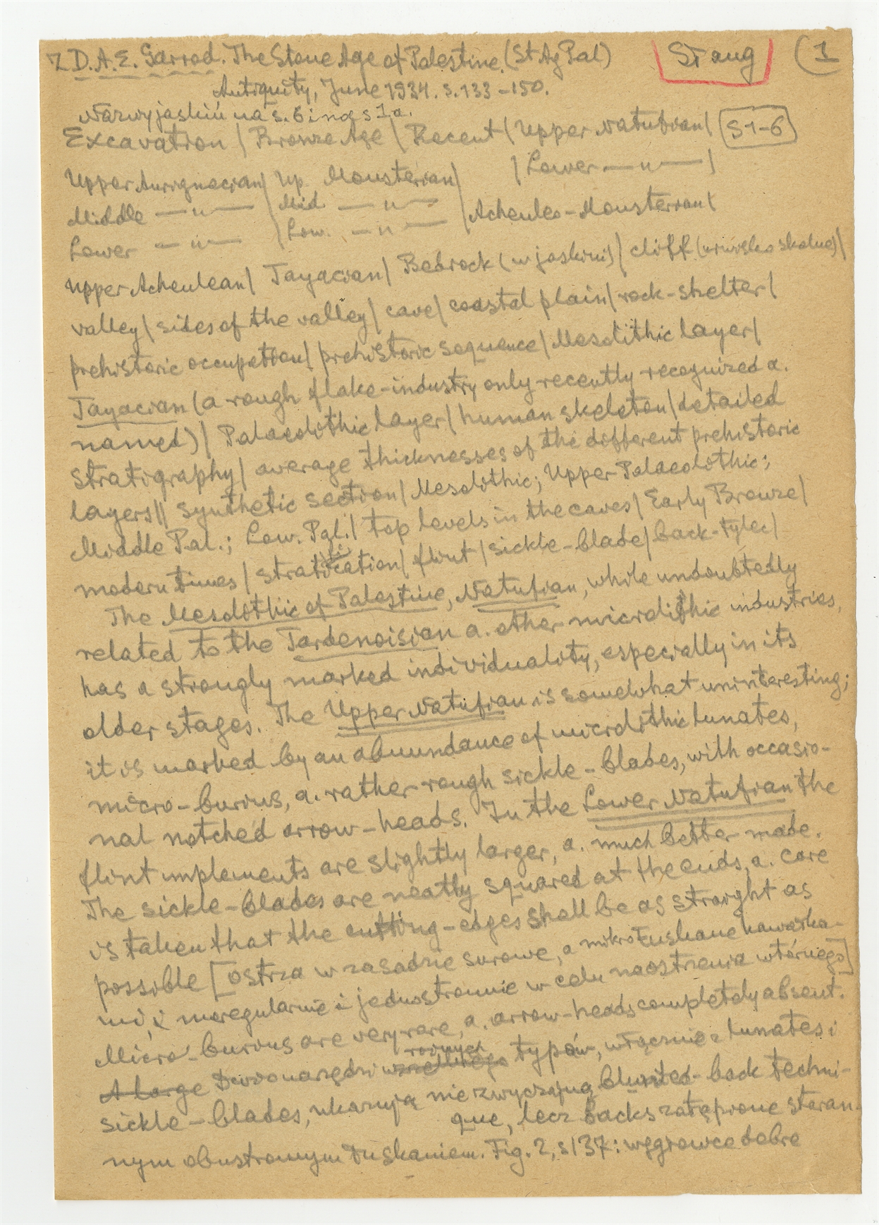 Rękopis wypisów z publikacji D. A .E Garrod'a The Stone Age of Palestine "Antiquity" 1934 s. 133-150 - strona 1: "Excavation