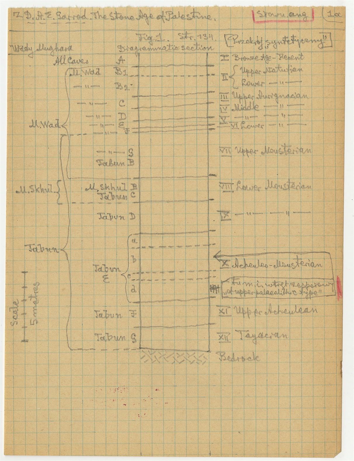 Rękopis wypisów z publikacji D. A .E Garrod'a The Stone Age of Palestine "Antiquity" 1934 s. 133-150 - strona 2: "Przekrój syntetyczny" (diagram rysunkowy)
