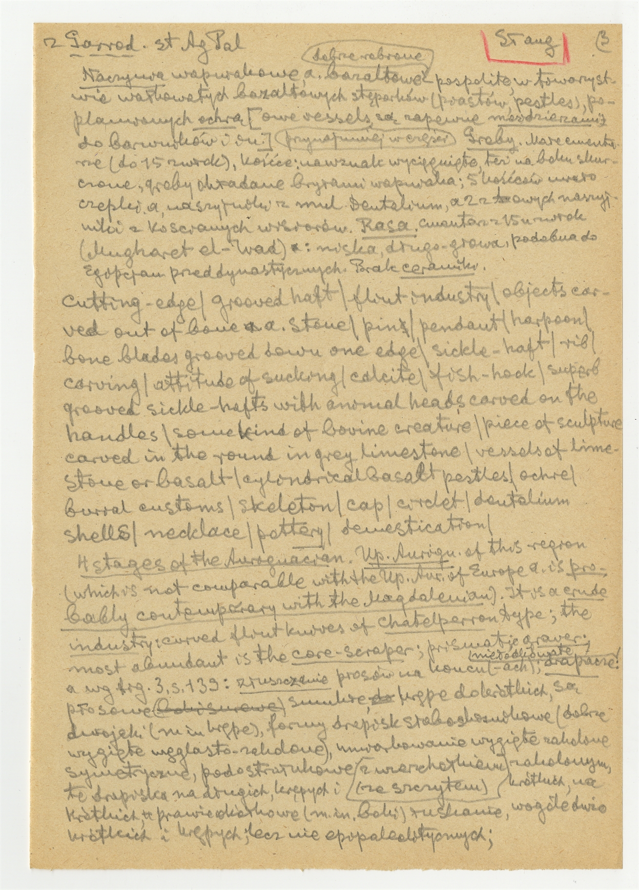 Rękopis wypisów z publikacji D. A .E Garrod'a The Stone Age of Palestine "Antiquity" 1934 s. 133-150 - strona 4: "(…) Naczynia wapniakowe a. bazaltowe (…)"