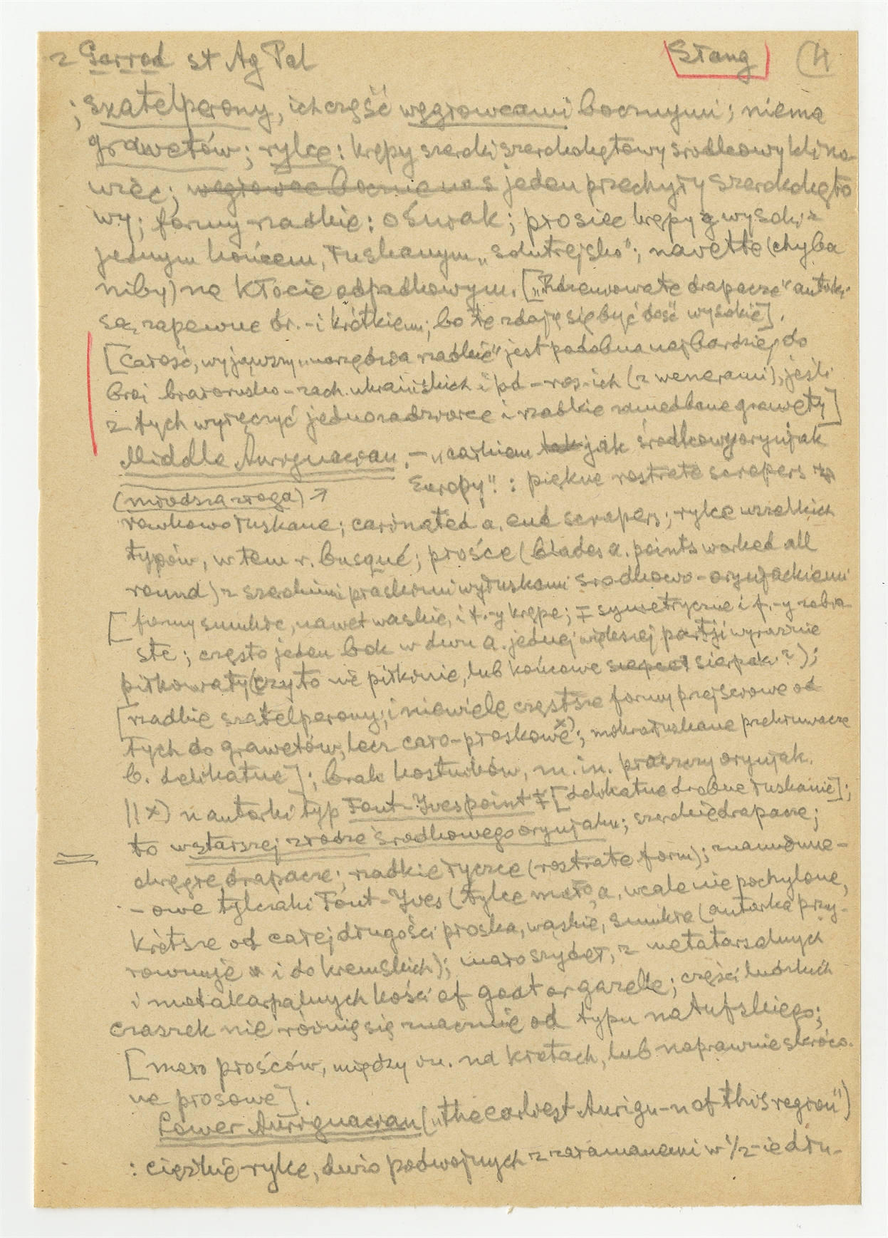 Rękopis wypisów z publikacji D. A .E Garrod'a The Stone Age of Palestine "Antiquity" 1934 s. 133-150 - strona 5: "(…) Szatelperony ich część węgłowcami bocznymi (…)"