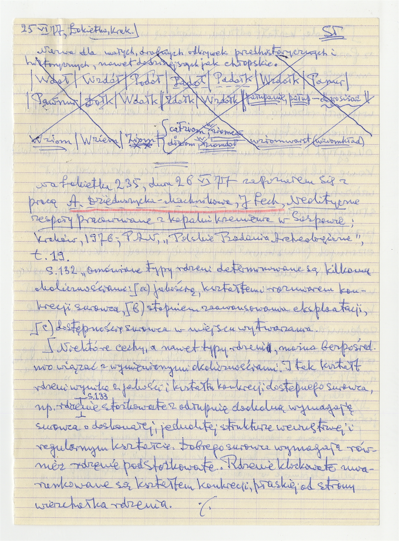 Rękopis wypisów z publikacji A. Dzieduszyckiej-Machnikowej J. Lecha Neolityczne zespoły pracowniane z kopalni krzemienia w Saspowie - strona 1: "Na Łokietka 235 dnia 26 VI 77 zapoznałem się (…)"