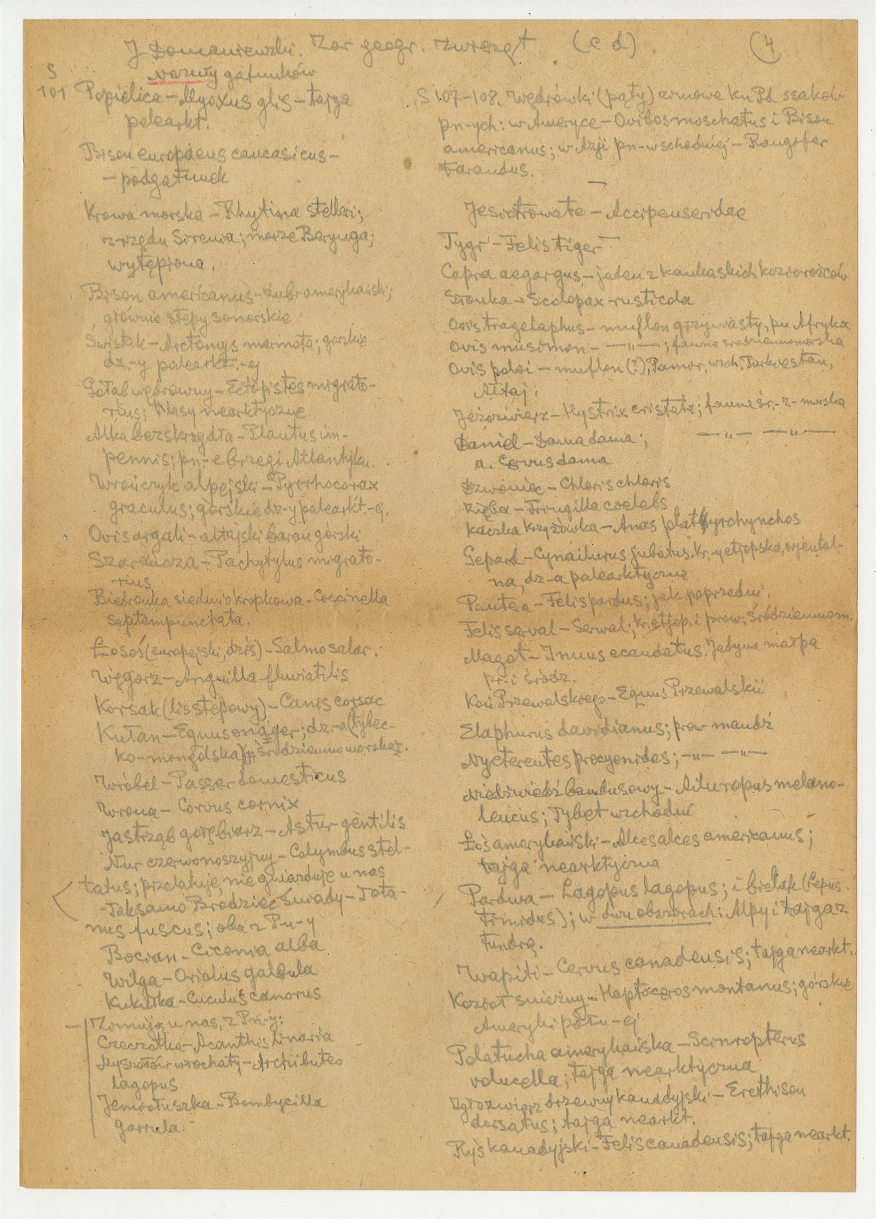 Rękopis wypisów z publikacji J. Domaniewskiego Zarys geografii zwierząt Warszawa-Kraków-Lublin-Łódź-Poznań-Wilno-Zakopane 1921 - strona 4: "Nazwy gatunków" c.d.
