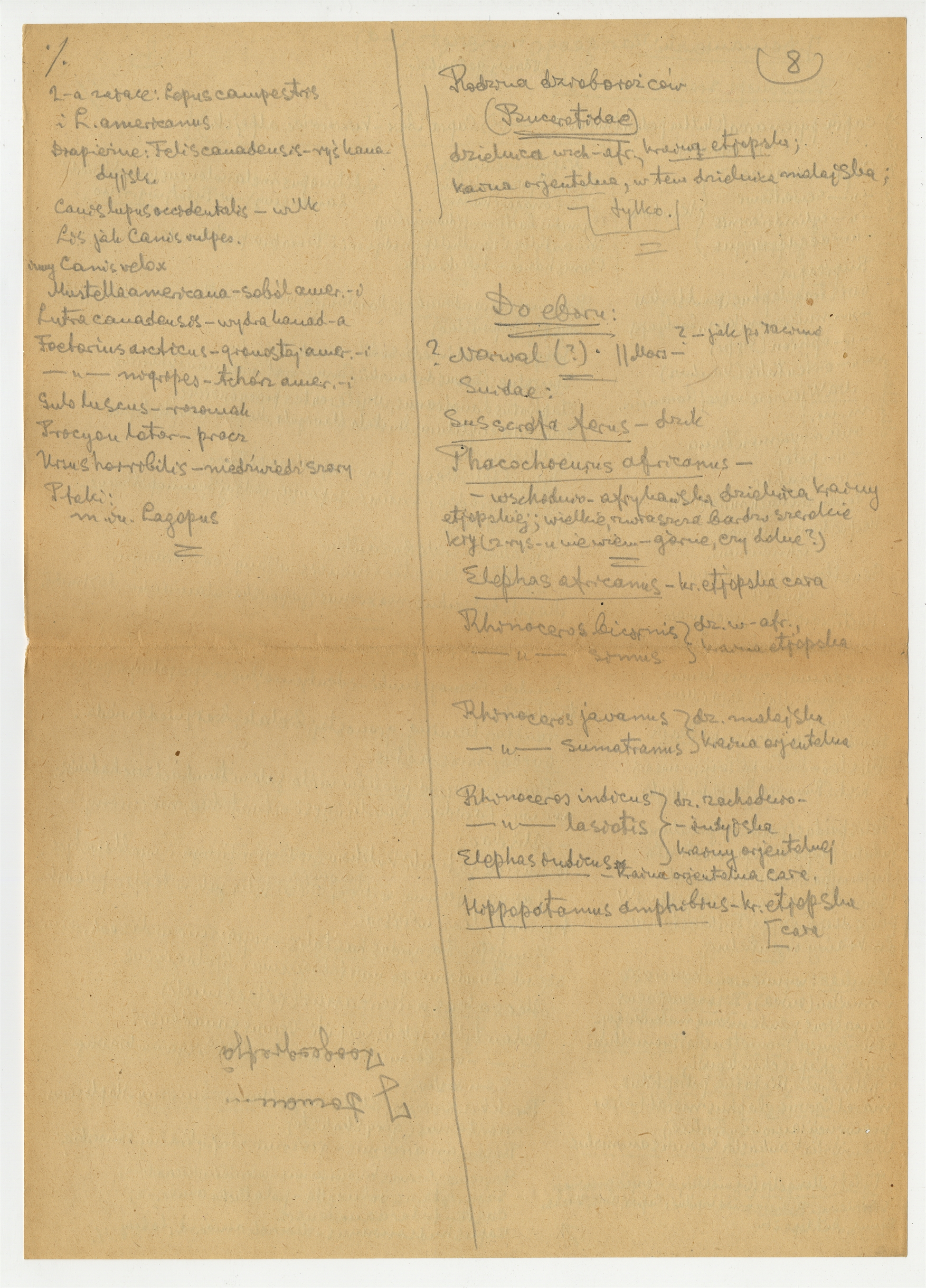 Rękopis wypisów z publikacji J. Domaniewskiego Zarys geografii zwierząt Warszawa-Kraków-Lublin-Łódź-Poznań-Wilno-Zakopane 1921 - strona 8: "Nazwy gatunków" c.d.