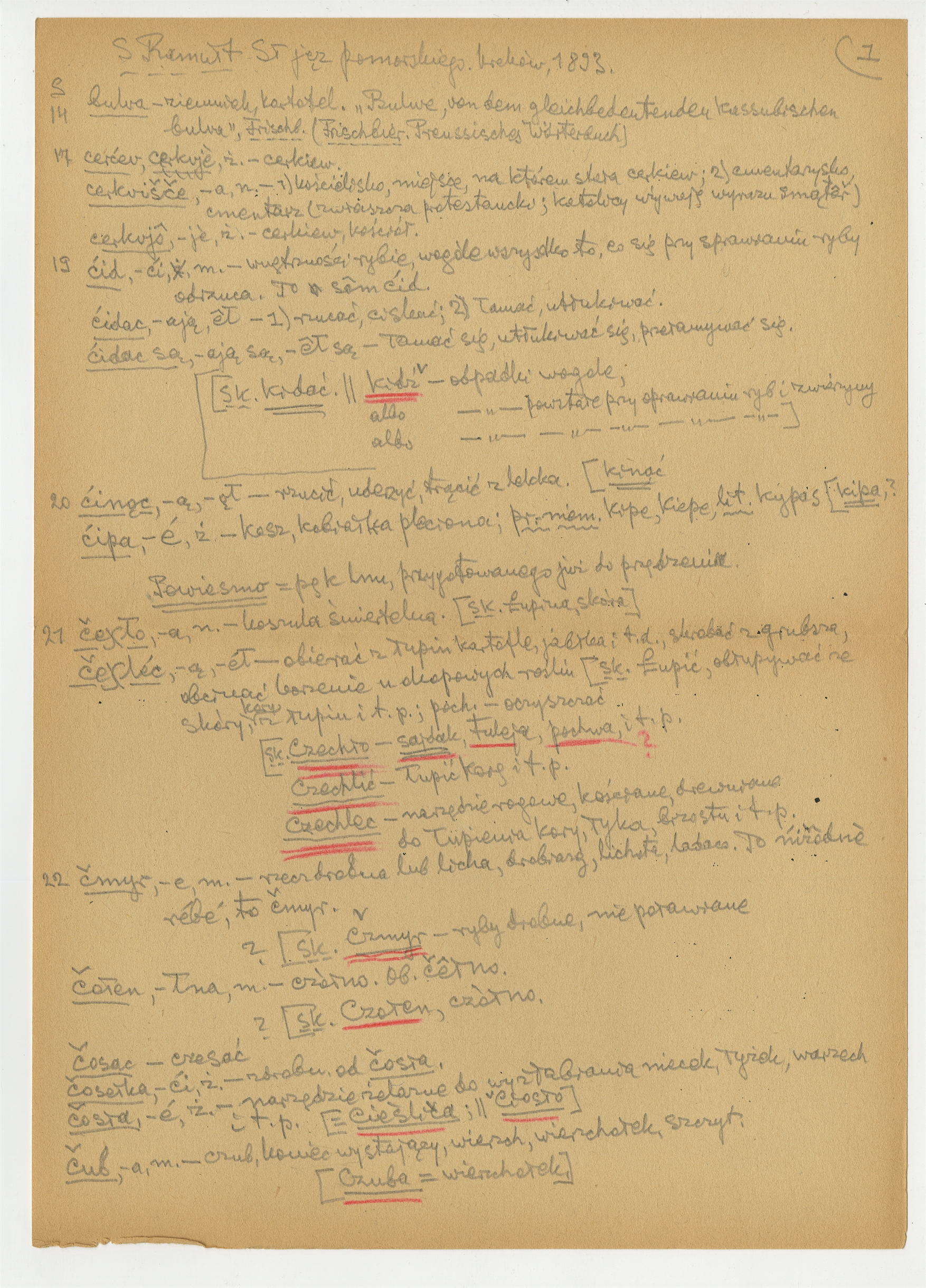 Rękopis wypisów z publikacji S. Ramułta  Słownik języka pomorskiego  Kraków  1893 - strona 1: "bulwa" […] "čub  -a  m."