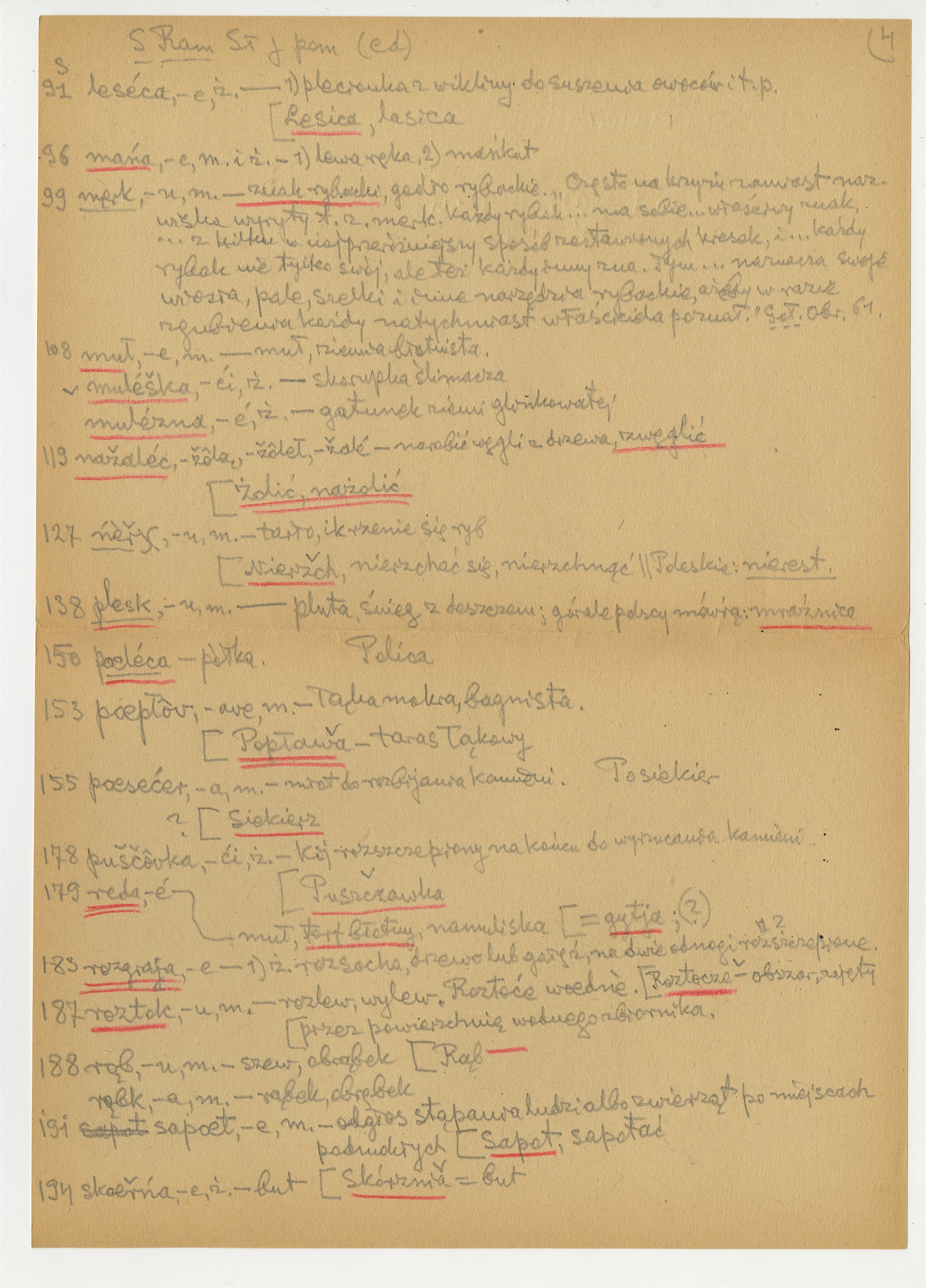 Rękopis wypisów z publikacji S. Ramułta Słownik języka pomorskiego Kraków 1893 - strona 4: "leséca -e ż." […] "skoeřńa -e ż"