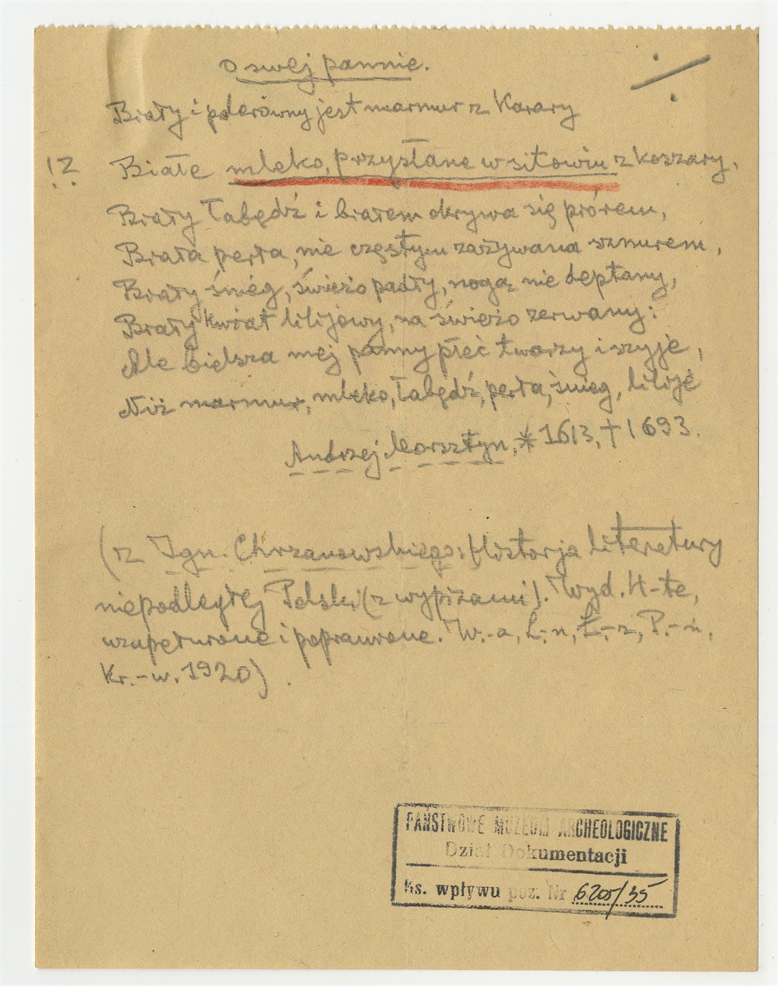 Rękopis - wypisy Stefana Krukowskiego z twórczości Jana Andrzeja Morsztyna o naczyniu z sitowia na mleko - "O swej pannie"