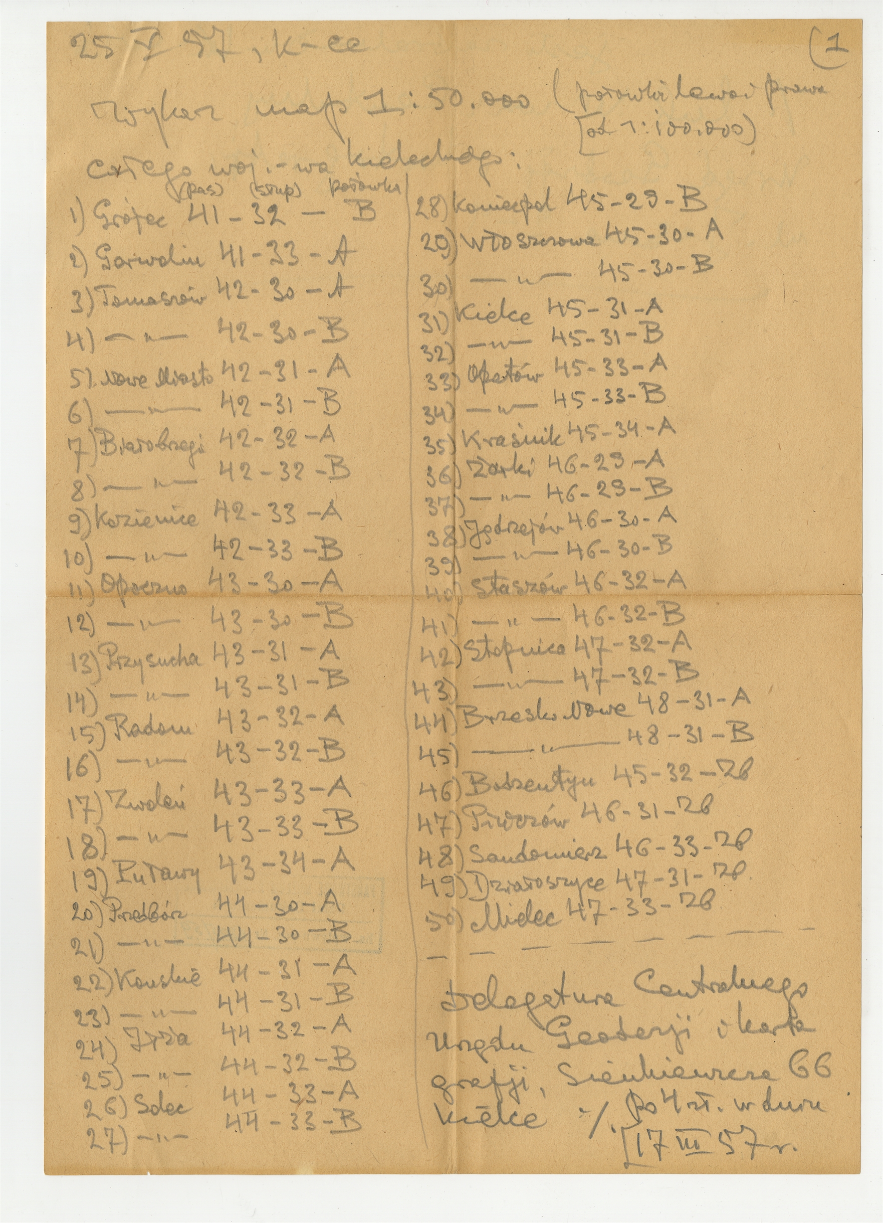 Rękopis z wykazem map w skali 1:50000 Kielce 25 V [19]57 r. - strona 1: wykaz map oraz adres Delegatury Centralnego Urzędu Geodezji i Kartografii w Kielcach