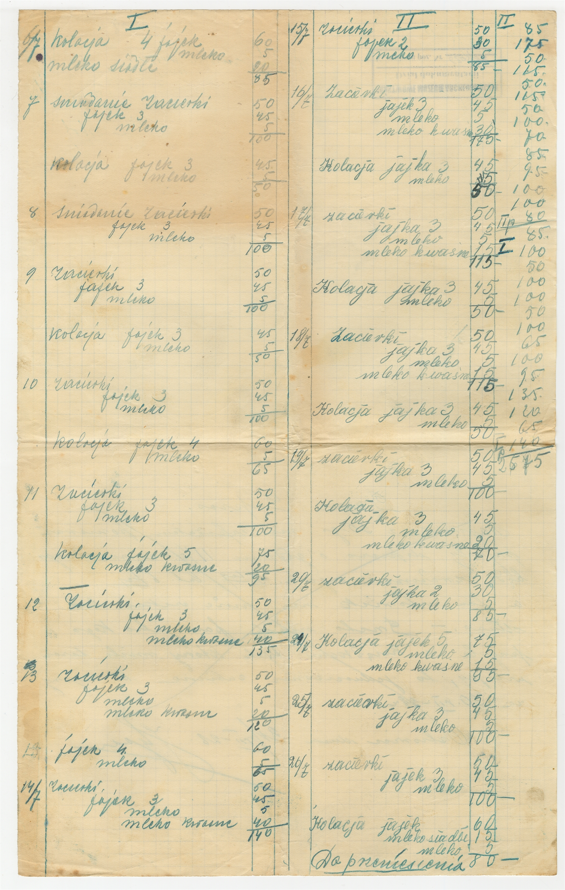 Rękopis zestawienia wydatków na żywność - strona 1