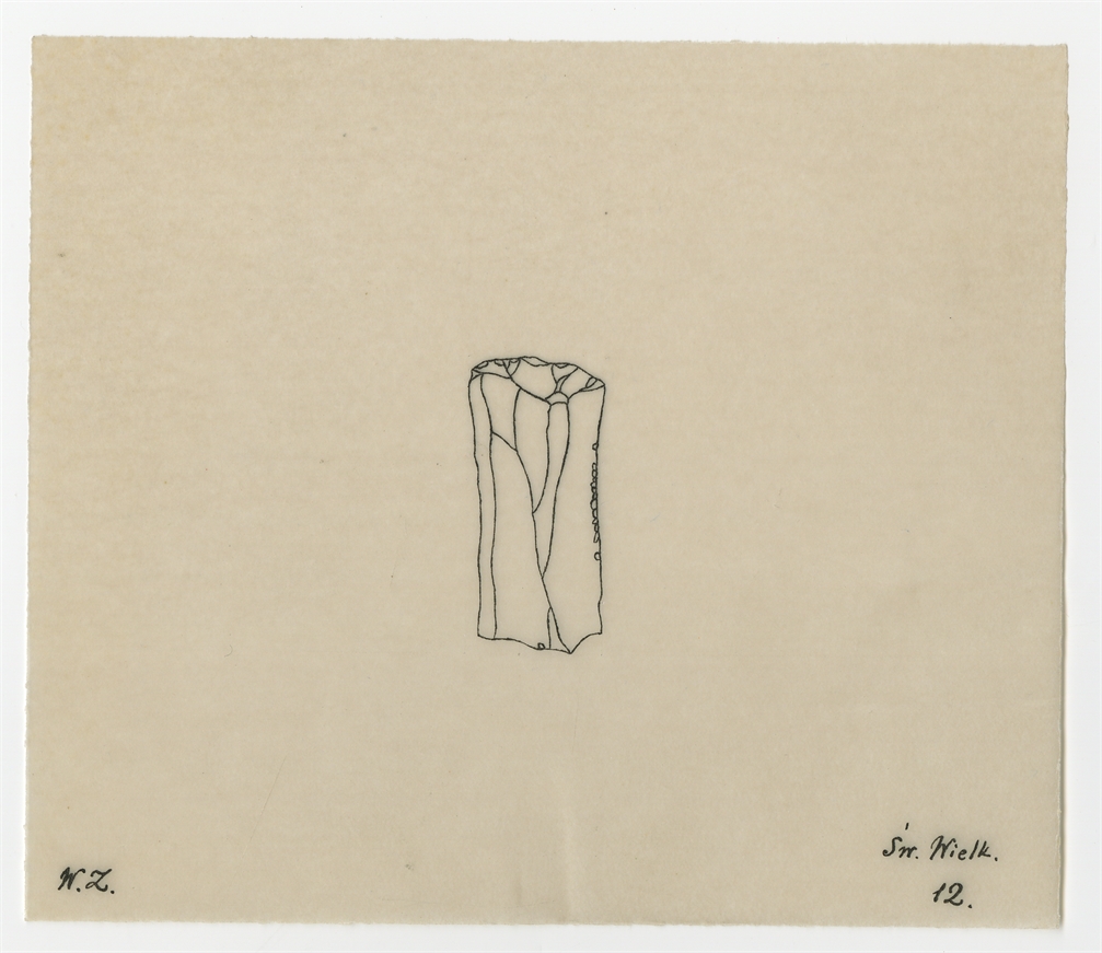 Rysunek konturowy zabytku krzemiennego ze stanowiska Świdry Wielkie. Tusz na kalce. Rysunek nr 12 sygnowany "W.Z."