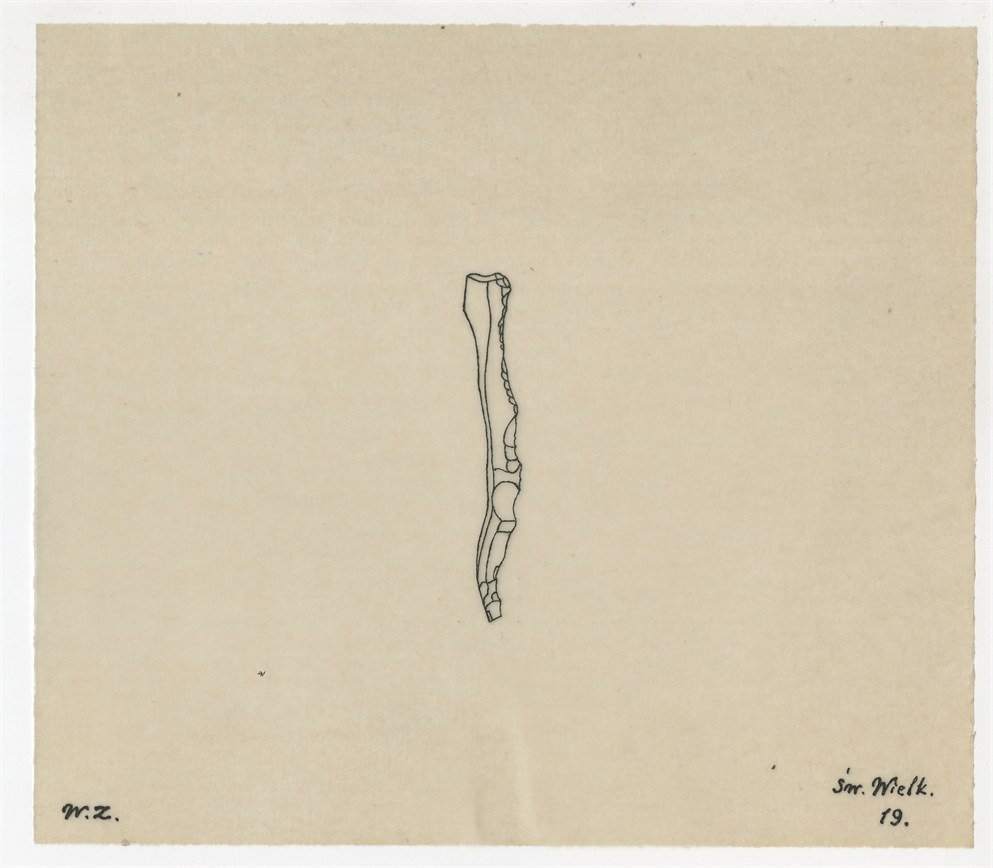 Rysunek konturowy zabytku krzemiennego ze stanowiska Świdry Wielkie. Tusz na kalce. Rysunek nr 19 sygnowany "W.Z."