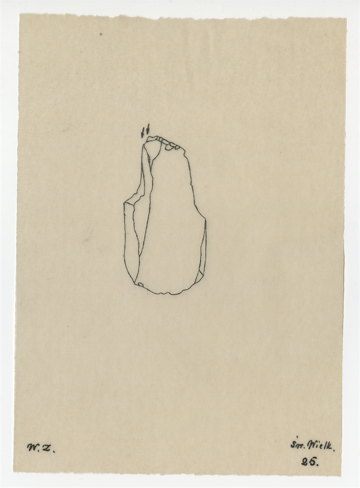 Rysunek konturowy zabytku krzemiennego ze stanowiska Świdry Wielkie. Tusz na kalce. Rysunek nr 25 sygnowany "W.Z."