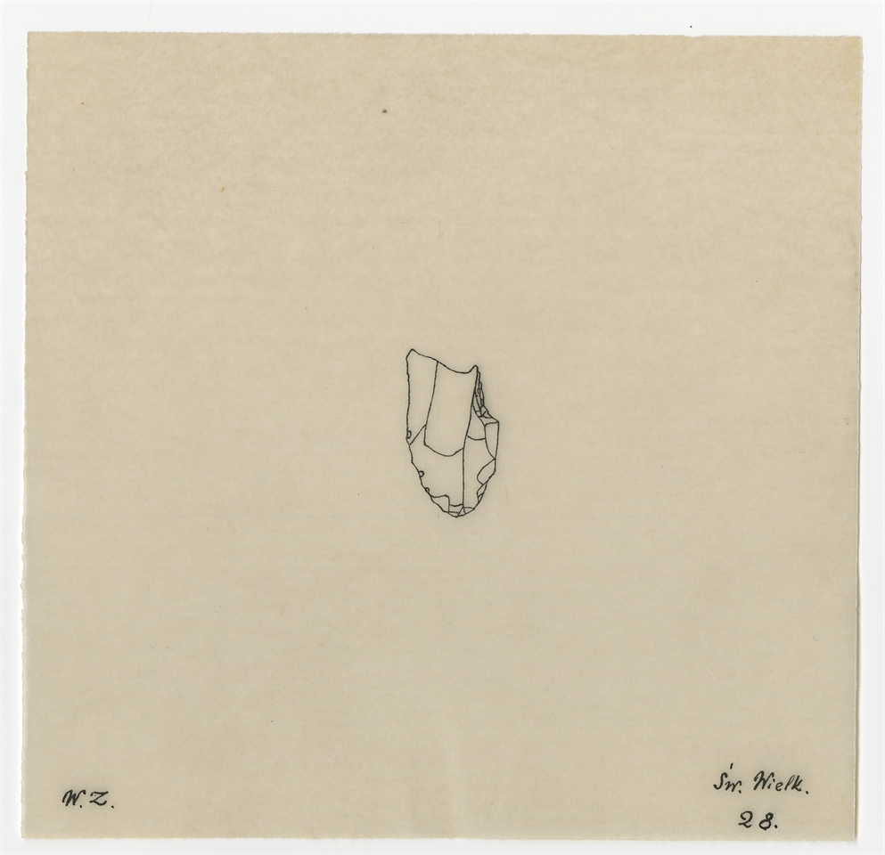 Rysunek konturowy zabytku krzemiennego ze stanowiska Świdry Wielkie. Tusz na kalce. Rysunek nr 28 sygnowany "W.Z."