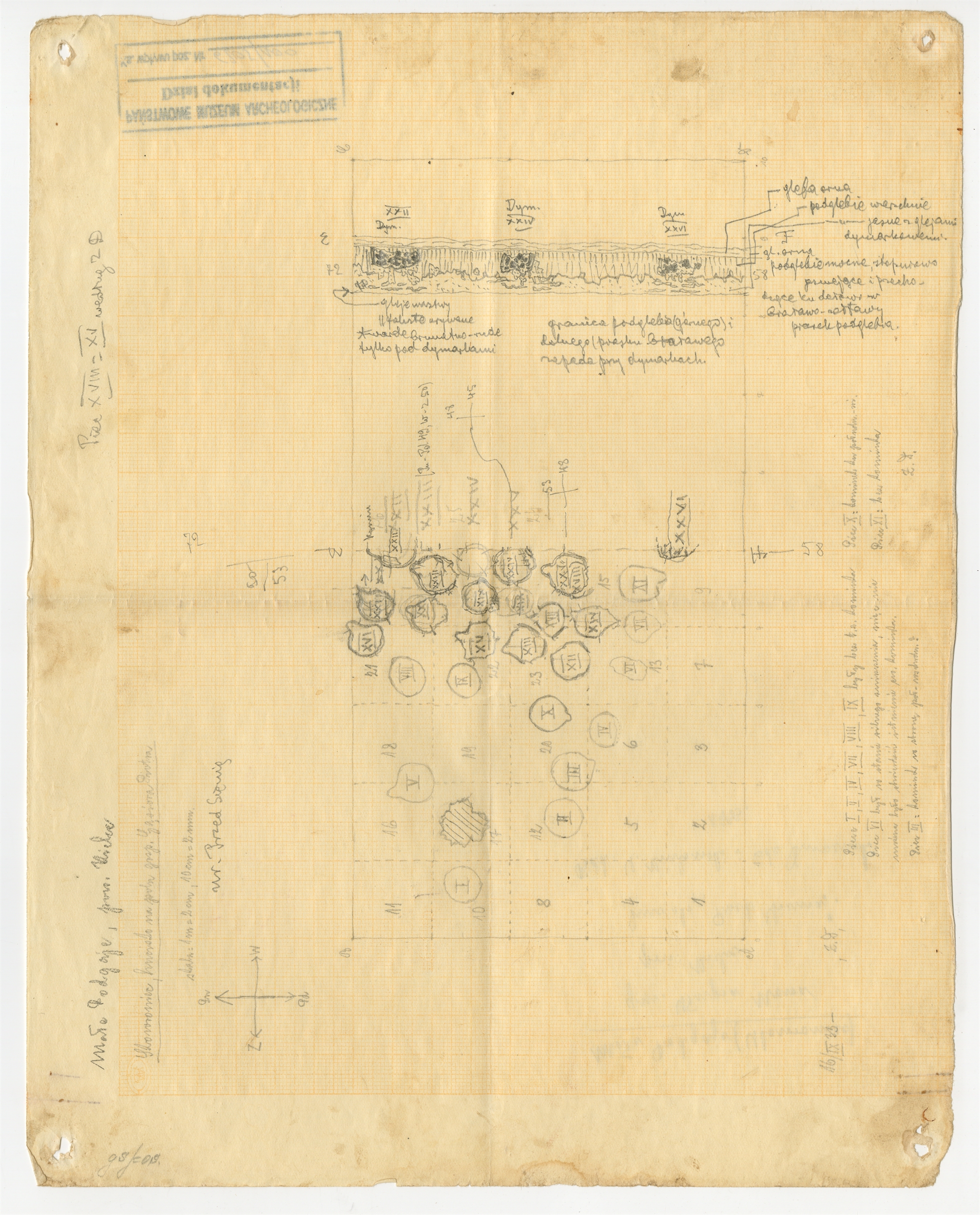 Rysunek polowy -plan obiektów z 16 IX [19]33 roku ze stanowiska Skowroniec (Małe Podgaje hucisko na polu Gąsiora Piotra). Skala wg autora 1m=2cm. Ołówek na papierze milimetrowym.