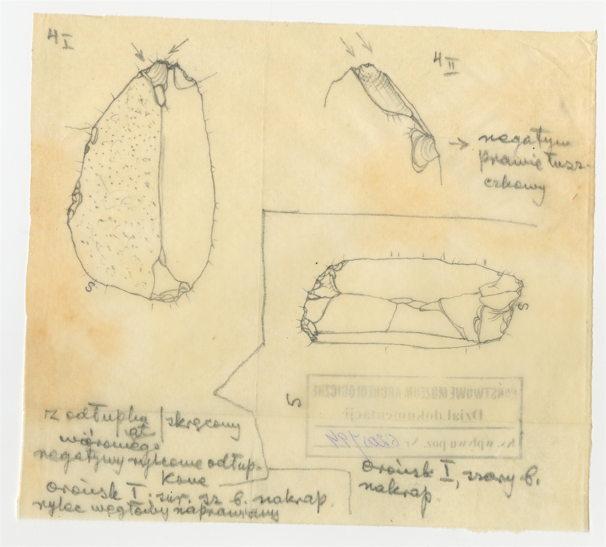 Rysunek zabytków krzemiennych. Ołówek na kalce. "Orońsk I"