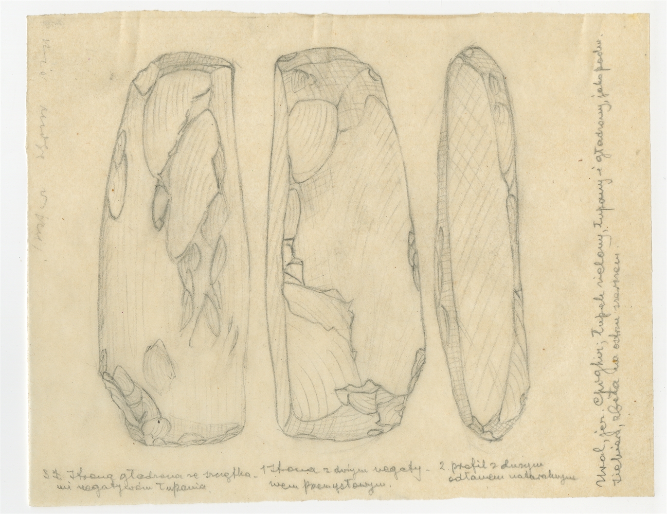 Rysunek zabytku kamiennego (łupek) ze stanowiska Szigir (Chighiz) na Uralu - zbiór Barona de Baye z końca XIX w. Ołówek na kalce