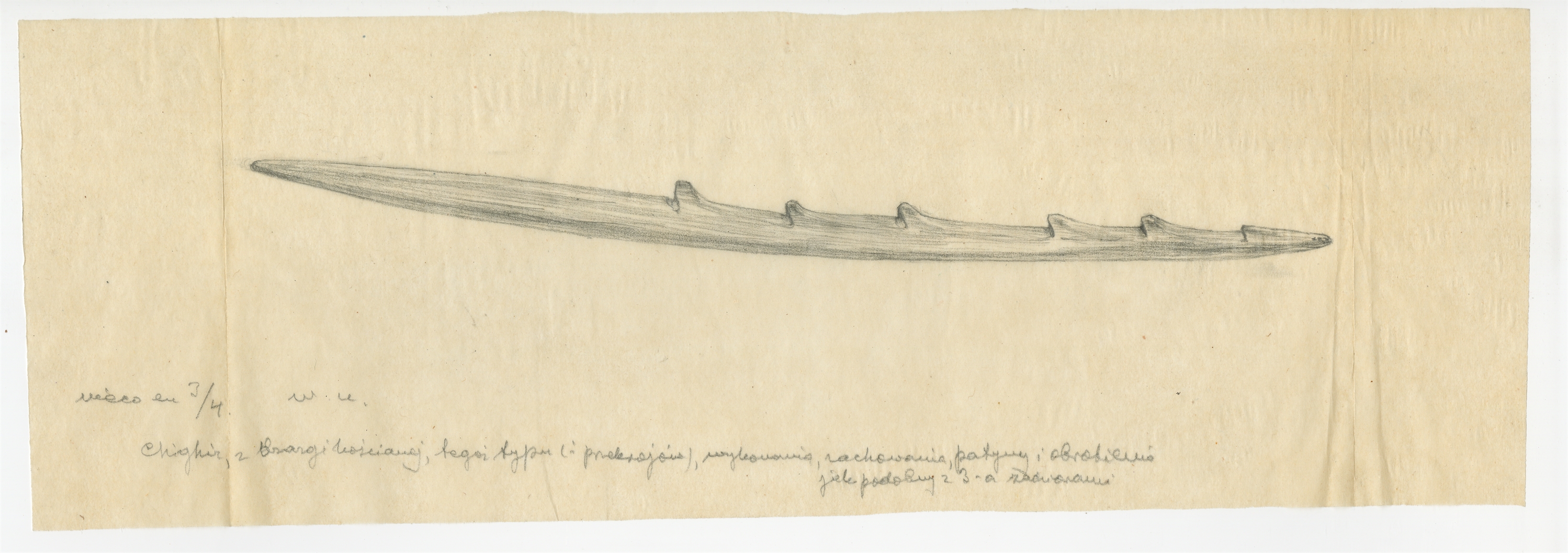 Rysunek zabytku kościanego ze stanowiska Szigir (Chighiz) na Uralu - zbiór Barona de Baye z końca XIX w. Ołówek na kalce