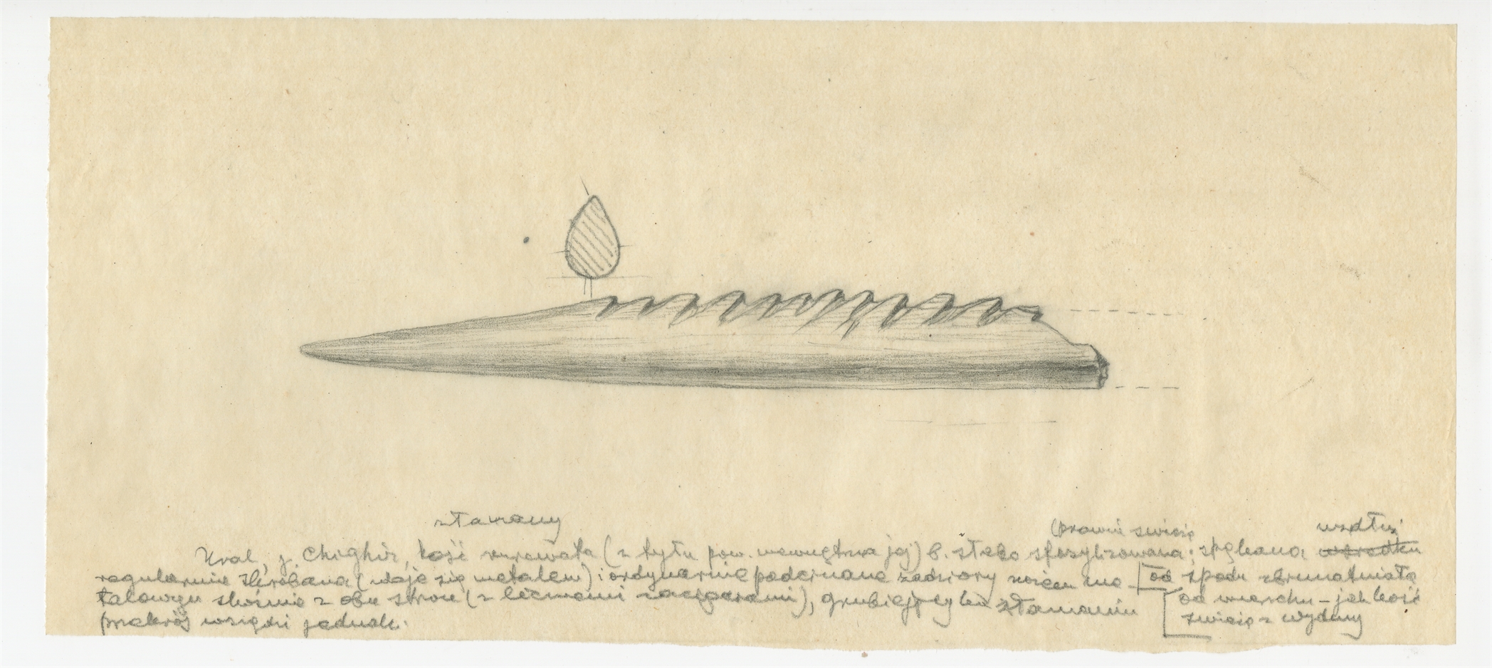 Rysunek zabytku kościanego ze stanowiska Szigir (Chighiz) na Uralu - zbiór Barona de Baye z końca XIX w. Ołówek na kalce