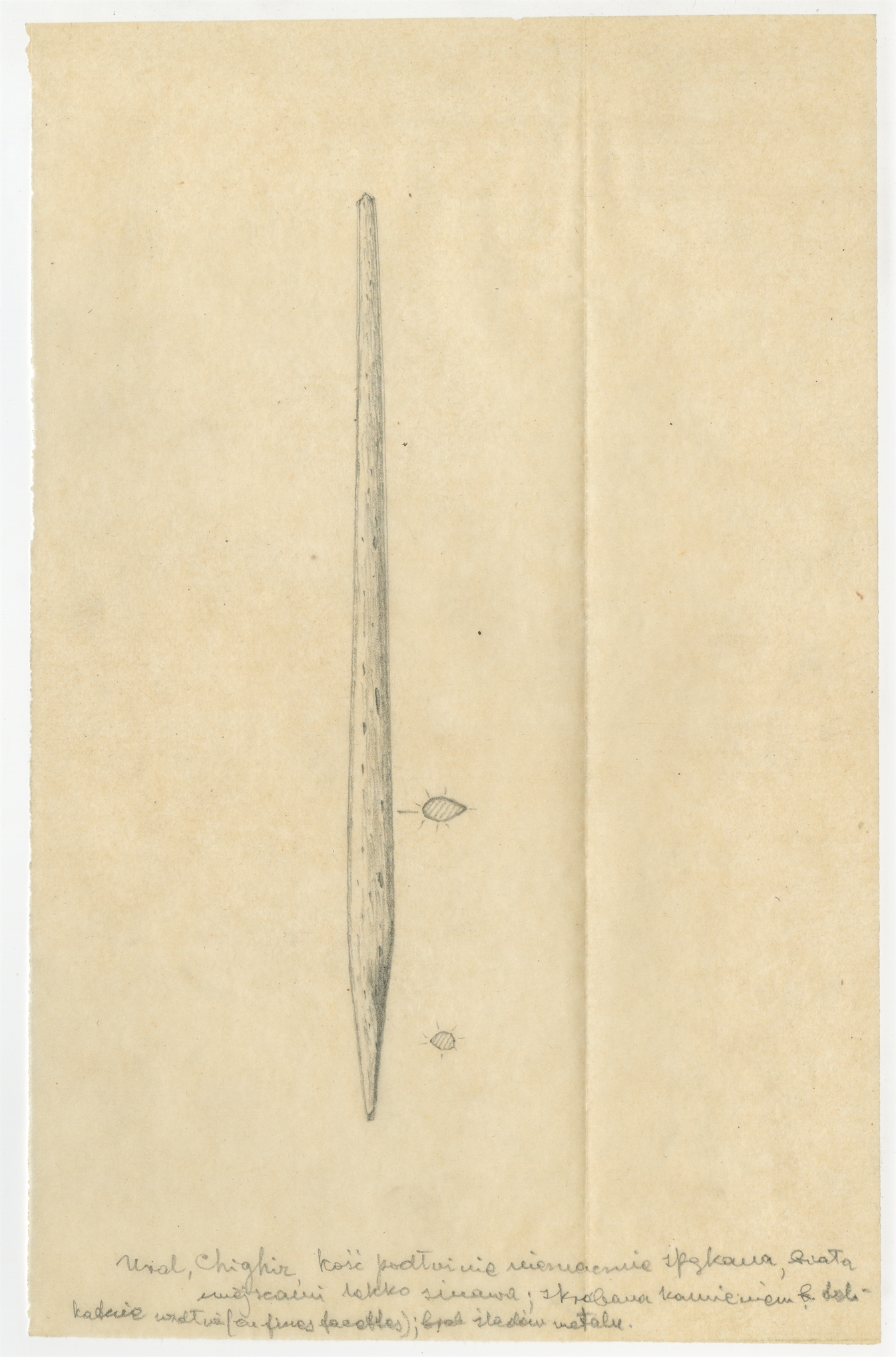 Rysunek zabytku kościanego ze stanowiska Szigir (Chighiz) na Uralu - zbiór Barona de Baye z końca XIX w. Ołówek na kalce