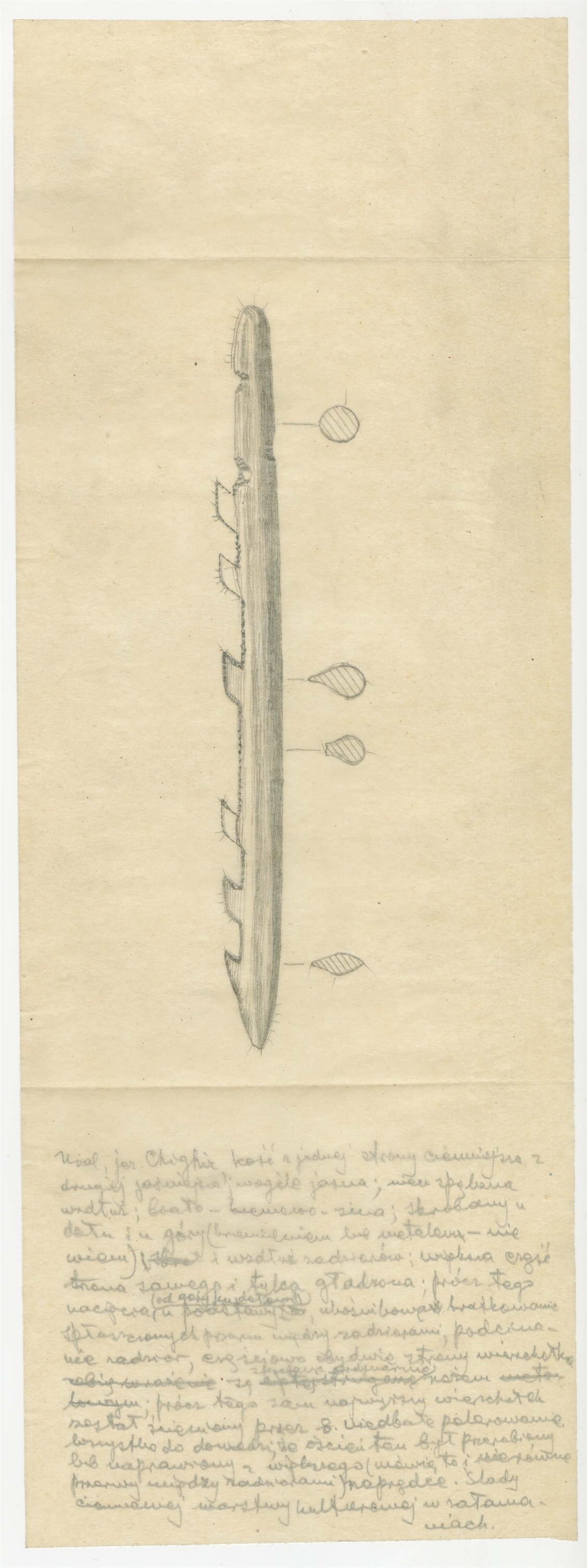 Rysunek zabytku kościanego ze stanowiska Szigir (Chighiz) na Uralu - zbiór Barona de Baye z końca XIX w. Ołówek na kalce