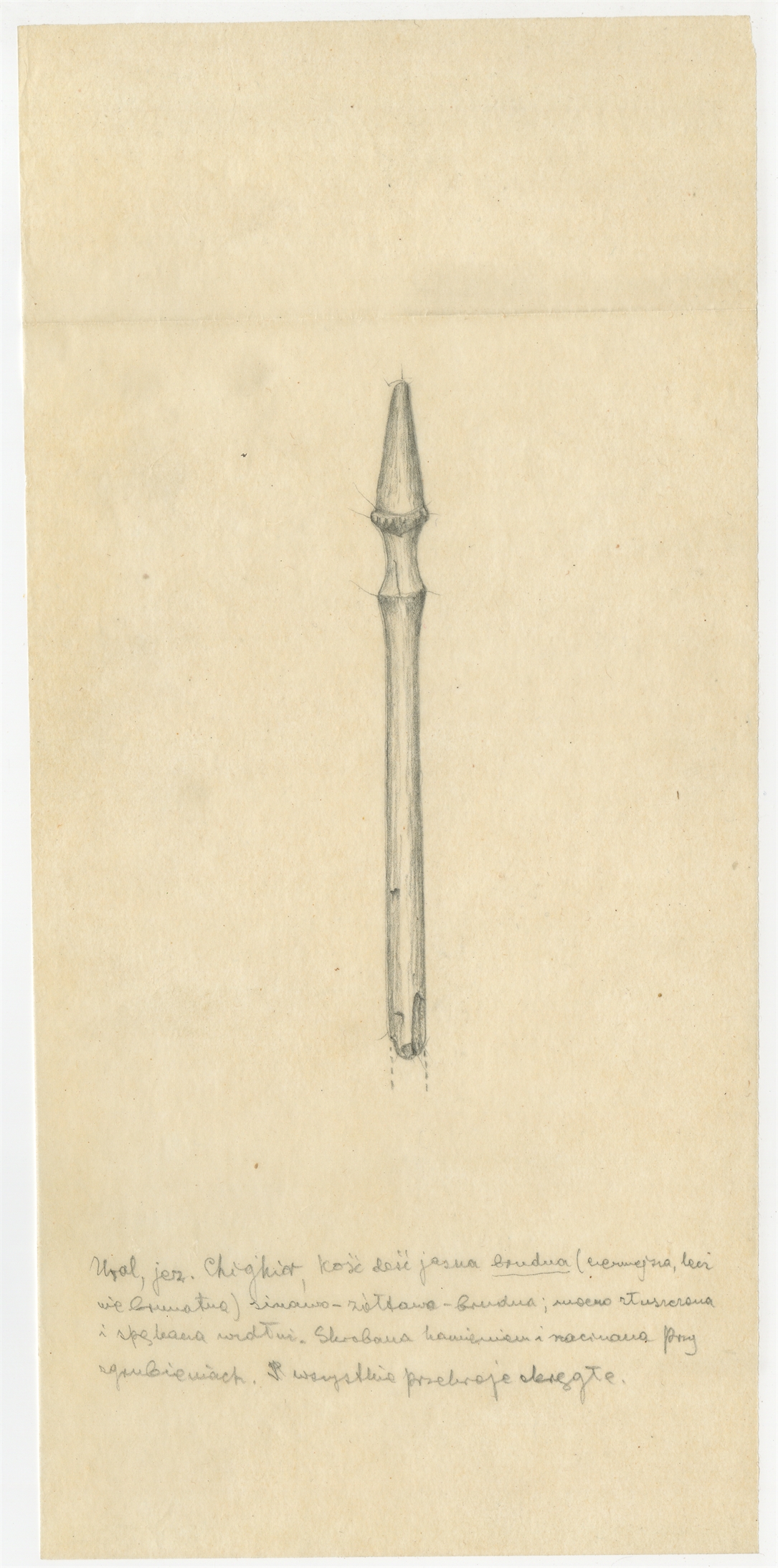 Rysunek zabytku kościanego ze stanowiska Szigir (Chighiz) na Uralu - zbiór Barona de Baye z końca XIX w. Ołówek na kalce
