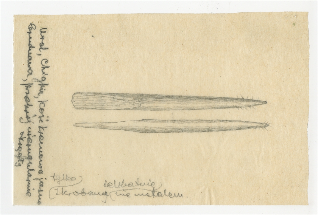 Rysunek zabytku kościanego ze stanowiska Szigir (Chighiz) na Uralu - zbiór Barona de Baye z końca XIX w. Ołówek na kalce