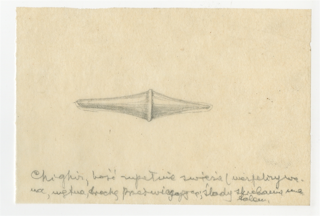 Rysunek zabytku kościanego ze stanowiska Szigir (Chighiz) na Uralu - zbiór Barona de Baye z końca XIX w. Ołówek na kalce